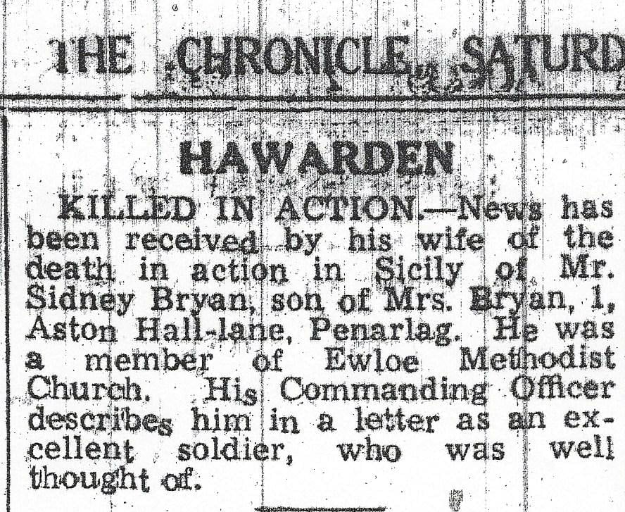 I found Sydney Walter Bryan’s death in the Chester Chronicle 28th August 1943 – Sydney BRYAN, Penarlag, KIA Sicily. See the newspaper cutting below.