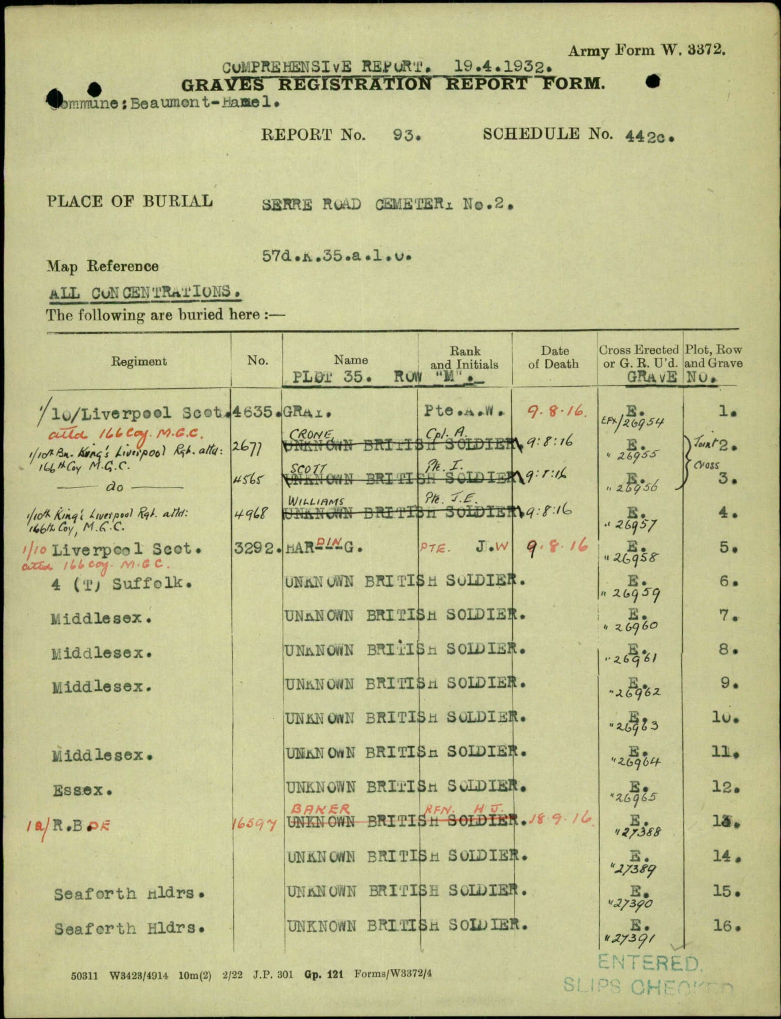 The Commonwealth War Graves Website gives details of the burial of John William Harding and it appears that he and another soldier, 4968 Pte. John Edward Williams, from the 1/10th Bn King’s Liverpool Regiment were buried together. Both men were Attached. to the 116th Coy M.G.C. and both died on the 9th August 1916. They were then exhumed and reburied at Serre Road Cemetery, possibly on the 7th December 1931 and with both bodies they recovered personal property, which is listed on the Burial Return. (see the CWGC Burial Return).