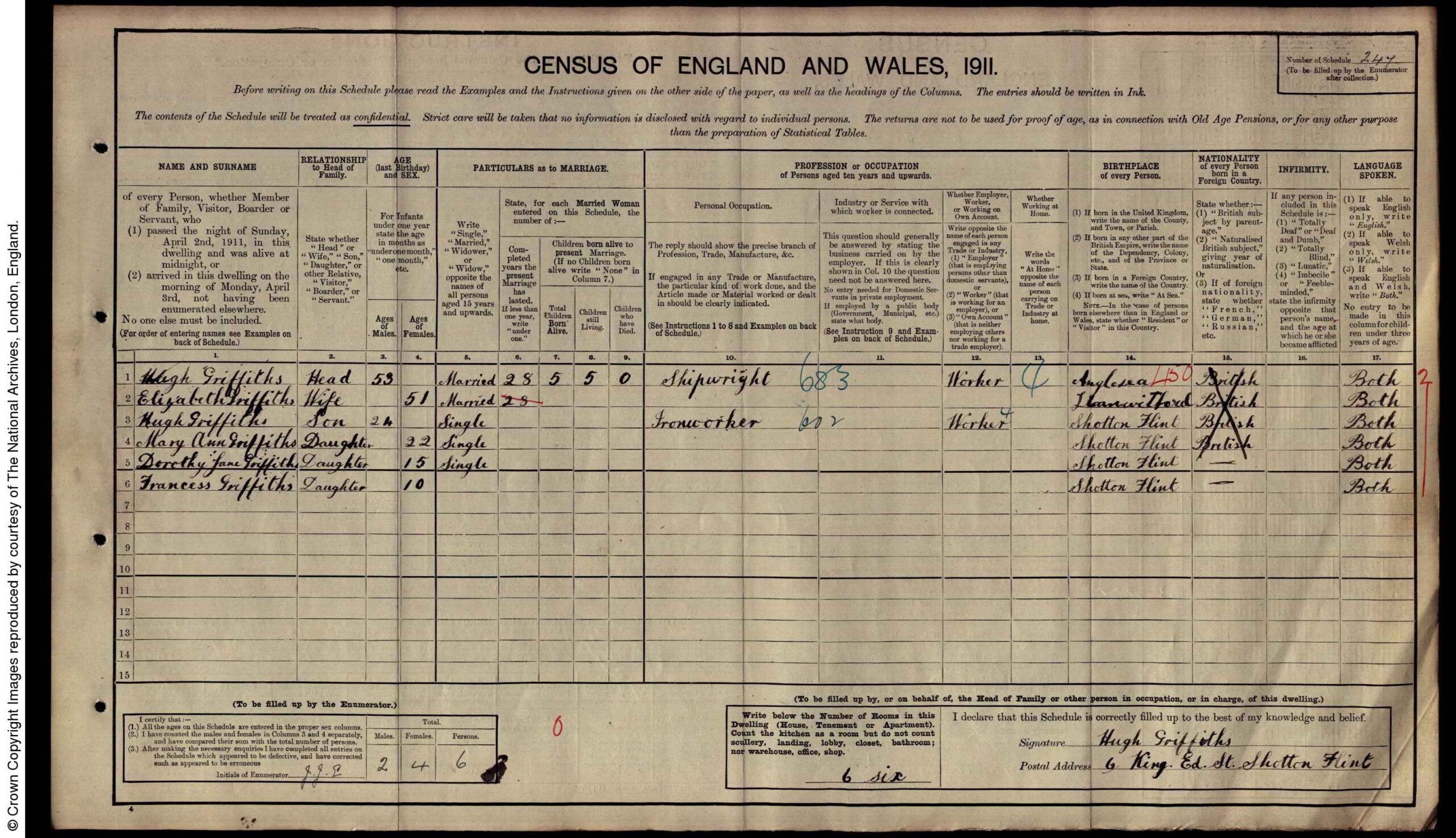 The 1911 census shows Frances Griffiths living at 6, King Edward Street, Shotton, Flintshire, all the family were Bilingual. Head of the household was Hugh Griffiths, 53, a Shipwright, born in Anglesea, his wife, Elizabeth, 51 had been born at Llanwitford. She tells us that they had been married 28 years and 5 children had been born, all still living. Their children were Hugh, 24, single and an Ironworker, Mary Ann, 22 and single, Dorothy Jane, 15 and Frances10 had all been born in Shotton, Flintshire.