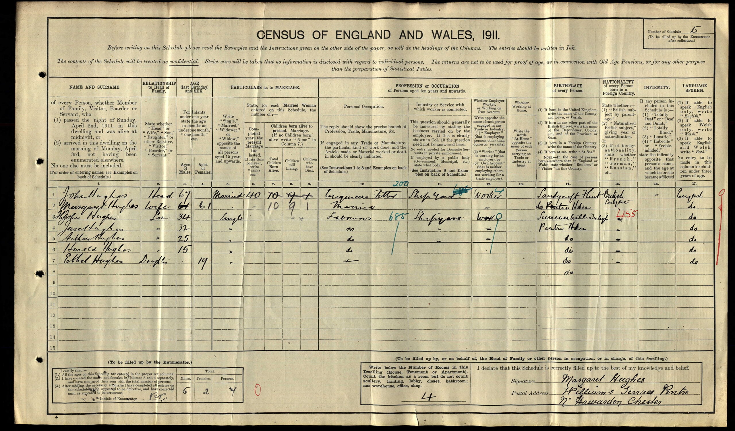 In 1911 Harold Hughes was living at William’s Terrace, Pentre, Nr. Hawarden, Chester in 4 rooms. Head of the household was John, 67 and Engineers Fitter (Shipyard) and had been born in Sandycroft, Flintshire. His wife Margaret, 61 had been born in Pentre, Hawarden, and she tells us that they had been married for 40 years and 10 children had been born to them, but sadly one had died. Their children were, Thomas John, 34, Single, he had been born in Summerhill, Denbighshire, Jesse, 32, Arthur, 25 were single and had been born in Pentre as had his two younger siblings. They were Labourers in the Shipyard. Harold, 15, was single and a Labourer, with Ethel, 19 and single.