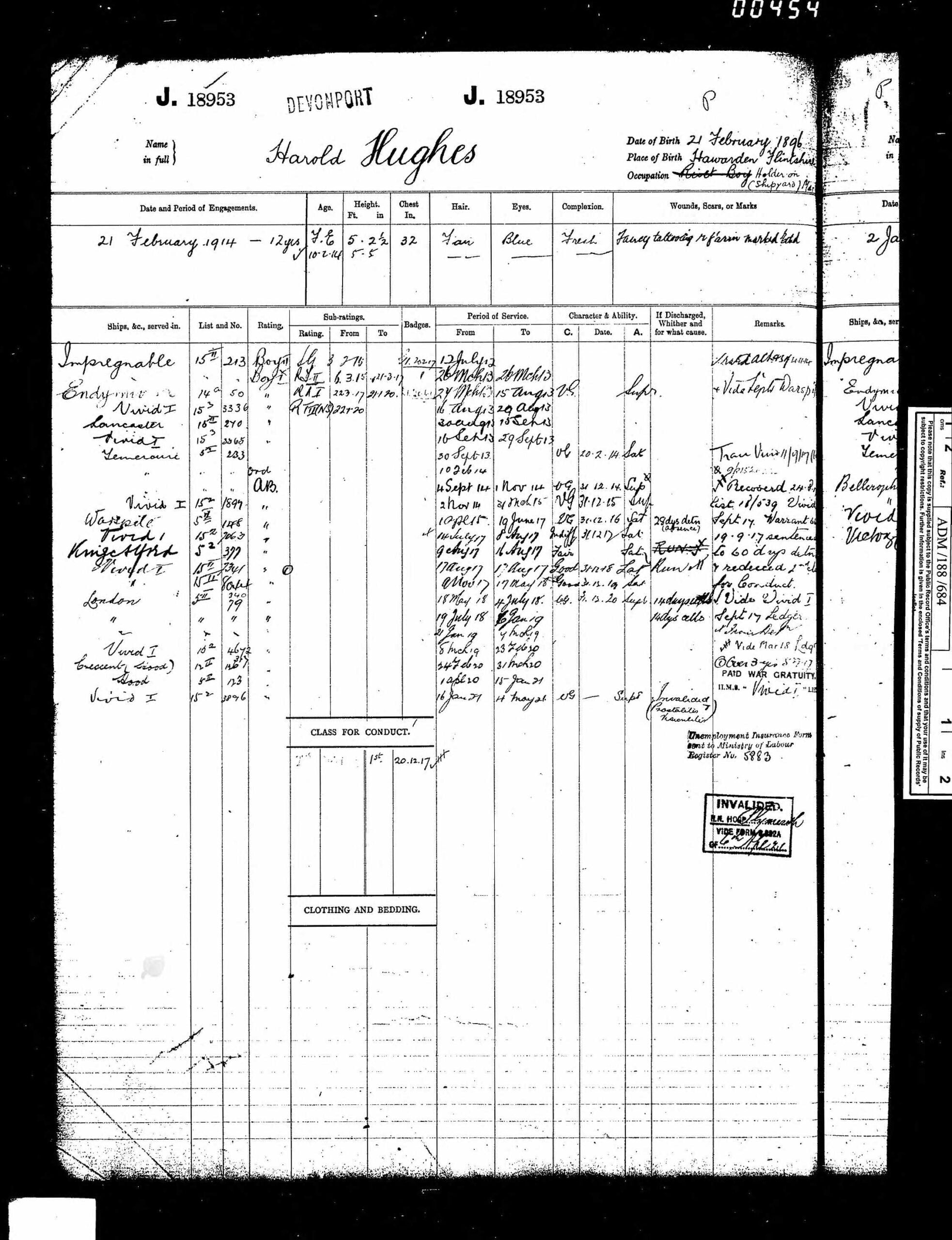 The following year, 1912, on the 12th of July, Harold had joined the Royal Navy, on the ‘Impregnable’and his last service date was the 4th of May 1921 on the ‘Vivid 1.’ His service number was J18953.