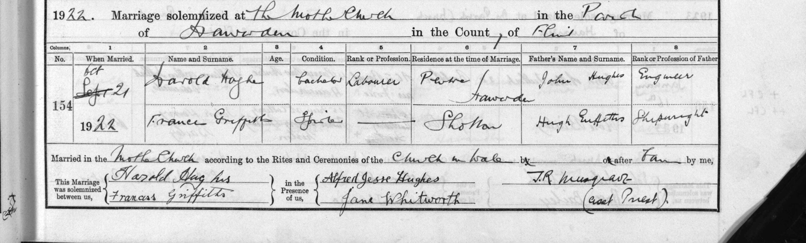 Harold & Frances had married in St. Deniol’s Church, Hawarden on the 21st of October 1922. Harold HUGHES, (No age given), Bachelor, Labourer, Pentre, Hawarden, John HUGHES, Engineer & Frances GRIFFITHS, (No age given),Spinster, Shotton, Hugh GRIFFITHS, Shipwright. (After Banns)