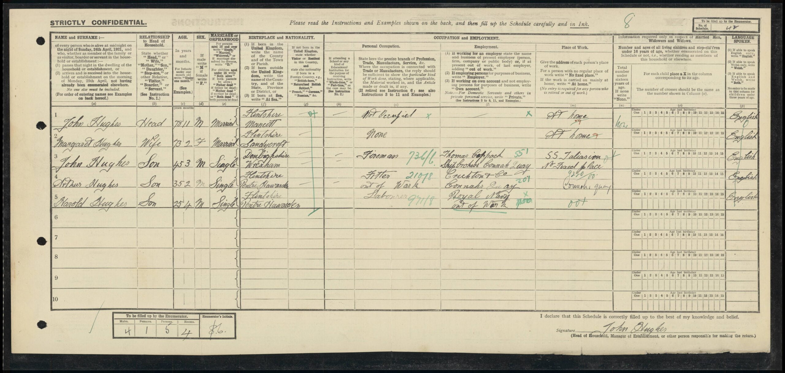 So, when the 1921 census was taken on the 19th of June 1921, he was back home with his family, living at Williams Terrace, Saltney Road, Queensferry (the same house as before, but the address had changed, as they do now and again). Head of the household was John Hughes now 78 years and 11 months old, he had no occupation, but was ‘At Home.’ Margaret Hughes was now 73 years and 2 months old; she too had no occupation. Their sons were John Hughes*, 45 years and 3 months old, he was a Fireman on S.S. Taliasion (sic), belonging to Thomas Coppack, Ship Brokers, Connah’s Quay. Arthur Hughes, 35 years, and 2 months old, a Fitter for Crichton & Co., Connah’s Quay, but was ‘Out of Work.’ Harold Hughes was 25 years and 4 months old; he was a Labourer but he wrote ‘Royal Navy, Out of Work.’