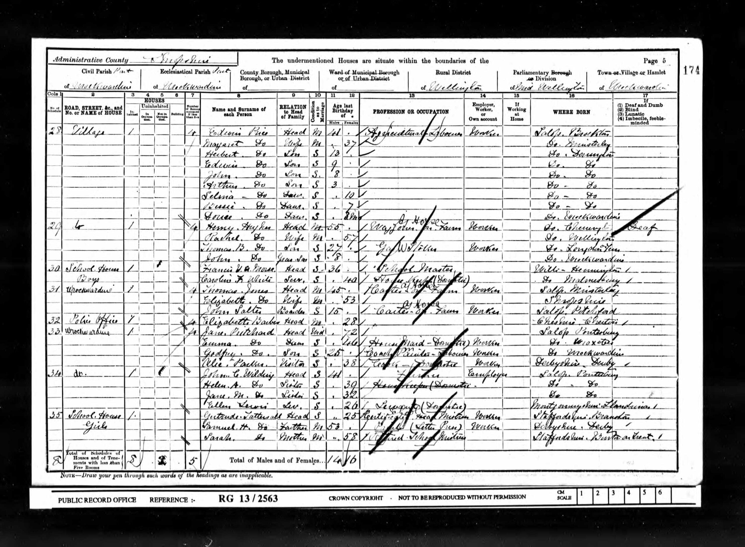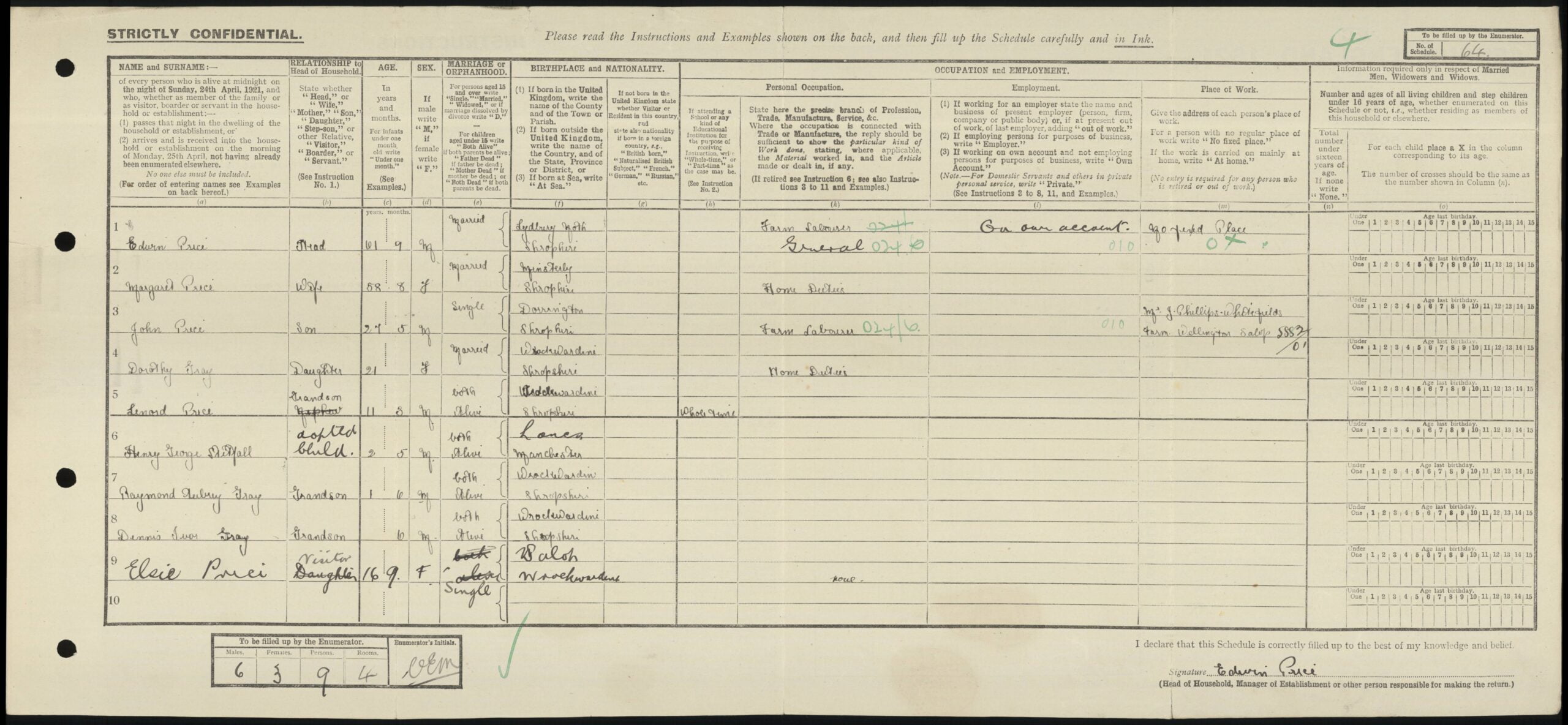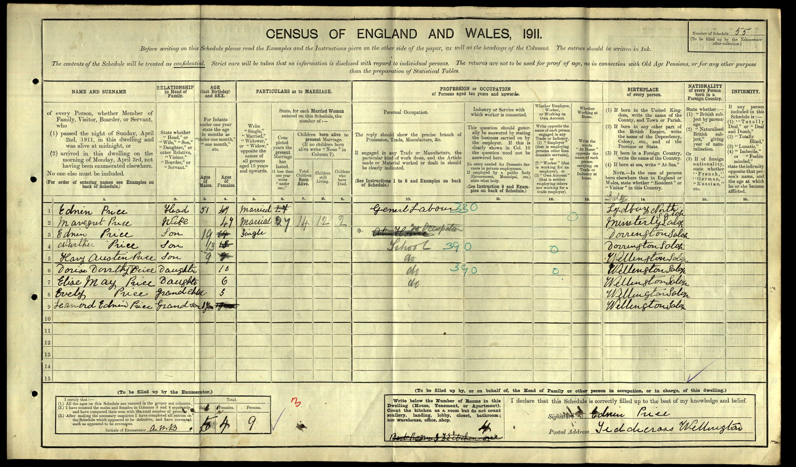 The family were living at Tiddiecross, Wellington, Wrockwardine, Shropshire. (4 rooms). Edwin Price, 51, was head of the household, and a General Labourer, who had been born in Lydbury, Salop, his wife Margaret, 47 had been born in Minsterley, Salop and they tell us that they had been married for 27 years and 14 children had been born to them, 2 of whom had sadly died. The eldest son on the census was Edwin, 19 and single, No Occupation, (At Home, crossed out by Enumerator), and Arthur, 13, both born Dorrington, Salop. Hary(sic) Austin, 9, Dorise(sic) Dorrthy (sic), 10 and Elise May, 6 all born Wellington, Salop. Two Grandchildren, Evely (sic), 5 and Leonard Edwin 1 year.