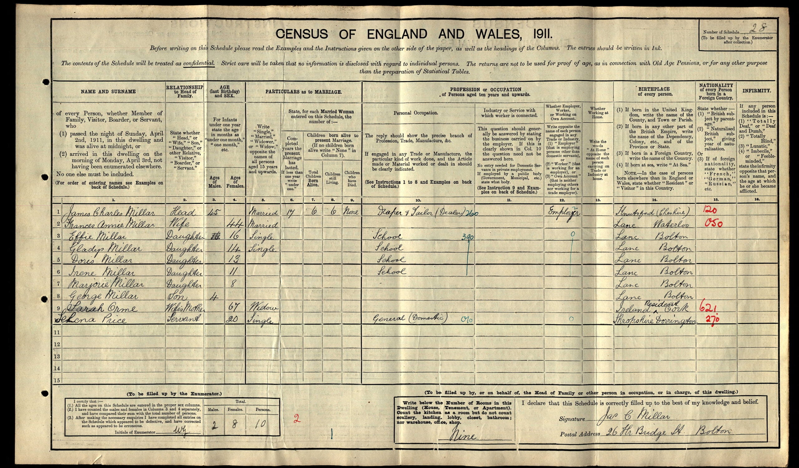 I believe his mother to be Selina Price, the daughter of Edwin & Margaret Price above. She is not on the 1911 census with her family. Selina Price, age 20 years and single, is seen on the 1911 census, living at 26, Hr. Bridge Street, Bolton, Lancashire, in the household of James Charles Millar, Draper & Tailor (Dealer), his wife Frances Annie Millar, five daughters and a son, with his Mother-in-Law, Sarah Orme. Selina was a General Servant (Domestic), she had been born in Dorrington, Shropshire.