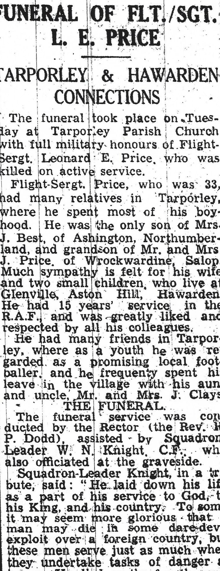 I do not know what happened to Leonard, his death is in the “Deaths Registered in the September quarter of 1943 (County Cheshire Volume 8A, Page 383). So, we know he died in Cheshire, but how or why he died, we do not know. Neither do we know why he was buried in Tarlorley, Cheshire and not at Hawarden, so any information would be gratefully received.