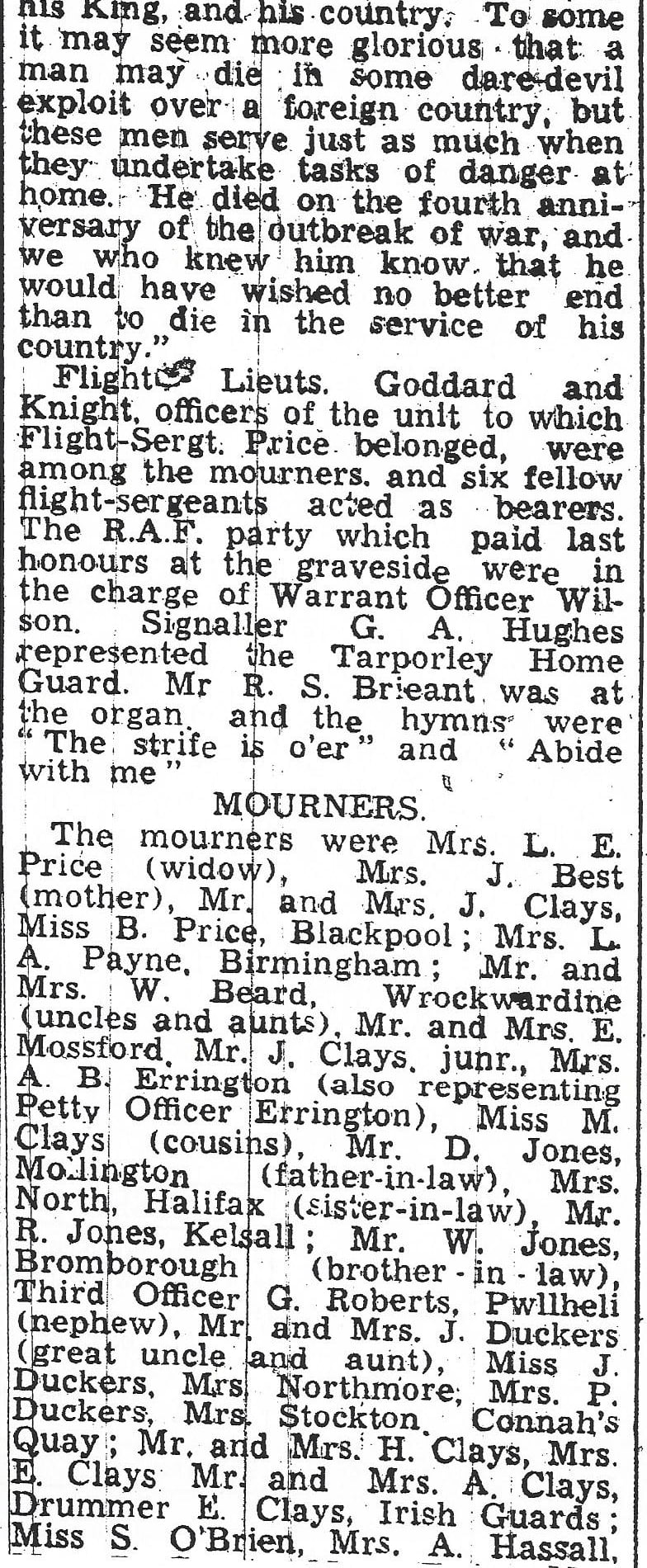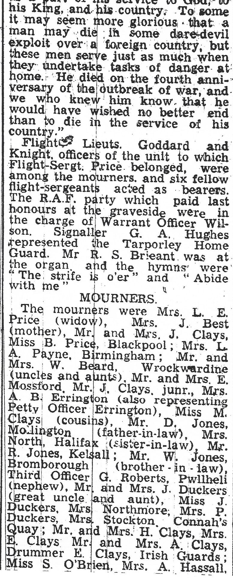 508981 F/Sgt Leonard Edwin Price, an armourer attached to 5131 Bomb Disposal Squadron and 30 MU, was fatally injured dismantling an explosive device at the Burton Ranges on the Wirral when it accidentally exploded on 2nd September. Admitted to Upton Emergency Hospital, Chester, he died at 16:10 hours on 3rd September.