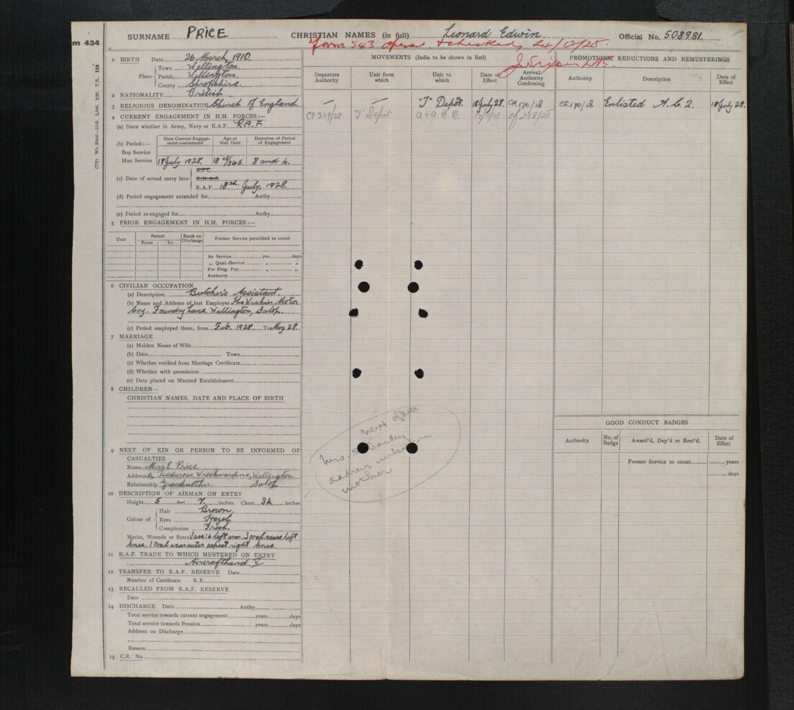 I do not know anything about his early life or teen years, except for the above, but according to the R.A.F. Service Record he enlisted at the age of 18 years. The next of kin mentioned are his grandmother Mrs. E. PRICE (Most women were known by their husband’s name i.e. Mrs Edwin Price.) Across from that, written in pencil was his next of kin being Mrs, S. Bailey, Mother, address, unknown. There is a short description of Leonard Edwin as well: –