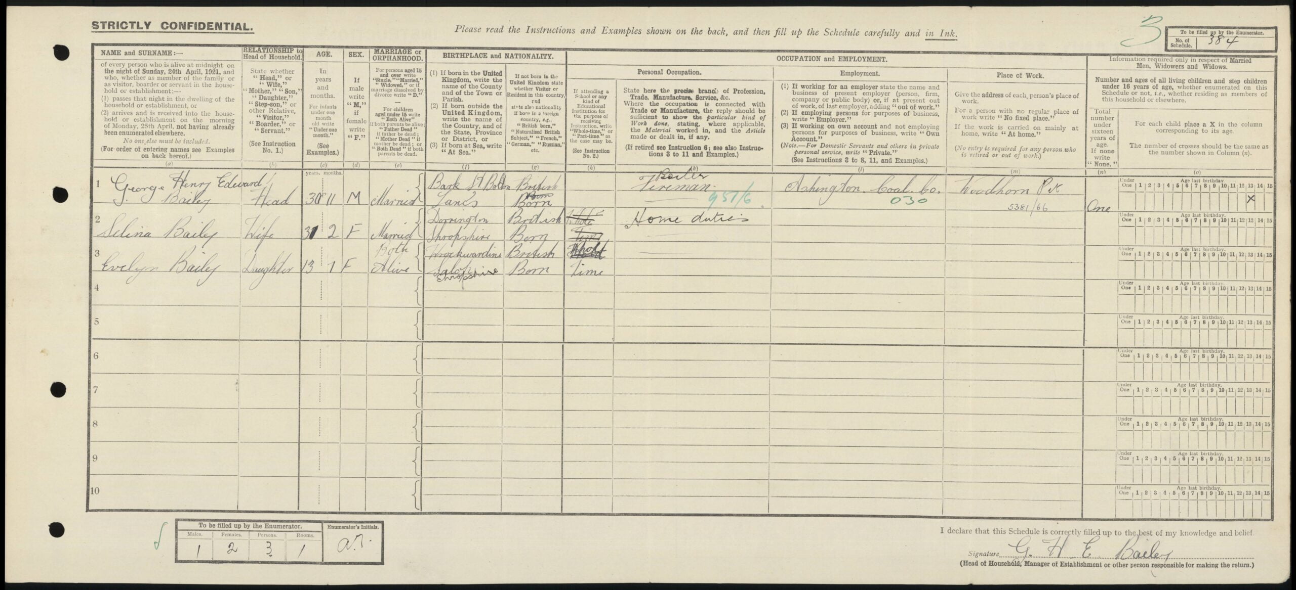 The 1921 census possibly answers the question about Evelyn, as she is seen living with her mother Selina Bailey at 84 ½, Poplar Street, Ashington, Northumberland. George Henry Edward Bailey was head of the household, and all relationships are to the head of the household. He was 10 years and 11 months old, he had been born in Bark Street, Bolton, Lancashire and was a Fireman (Boiler) at Ashington Coal Co., Woodhorn Pit. Sellina Bailey was 31 years and 2 months old, and she had been born in Dorrington, Shropshire, she was doing ‘Home Duties.’ Evelyn Bailey was described as their daughter and was 13 years and 7 months old, she had been born in Wrockwardine, Shropshire.