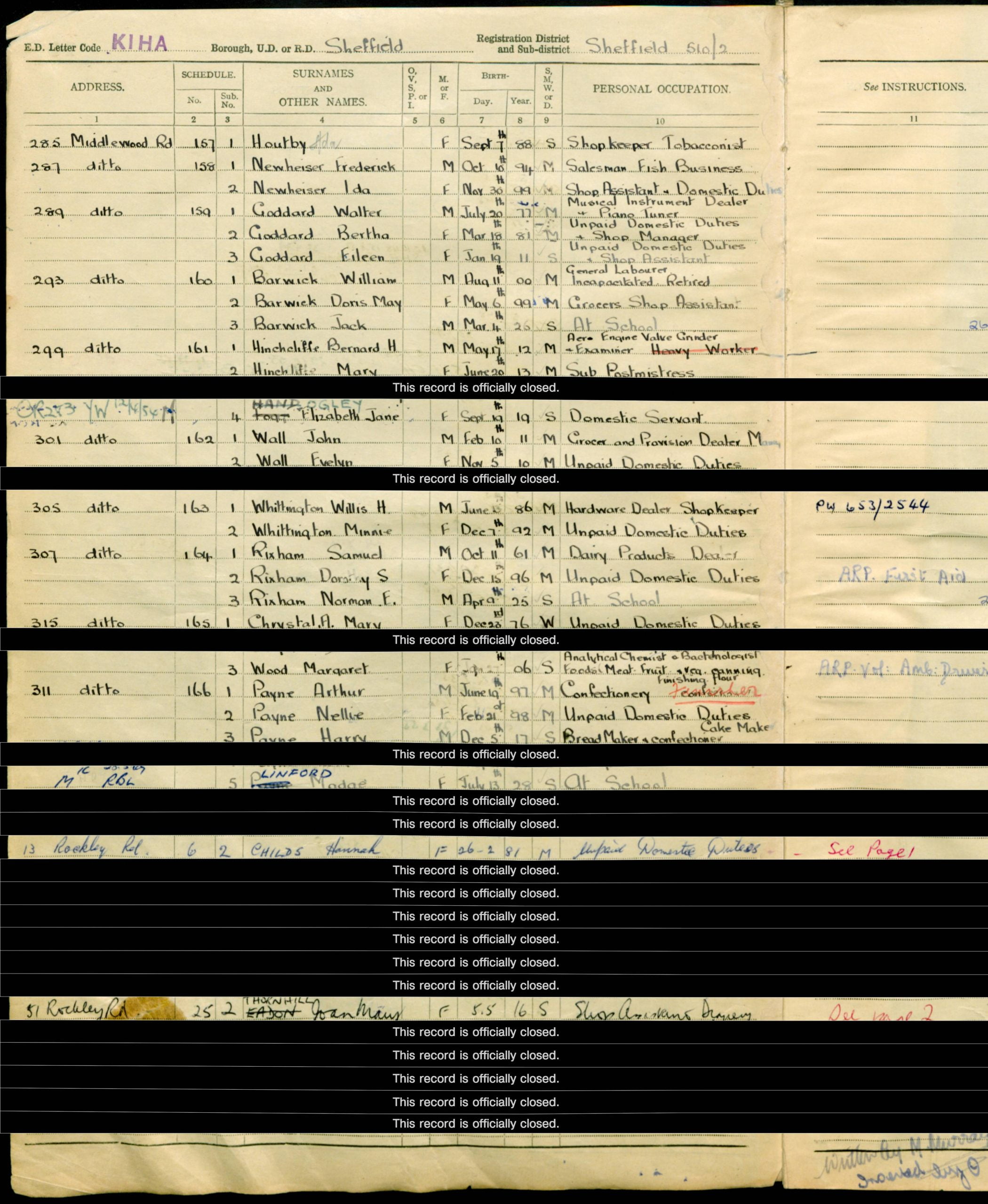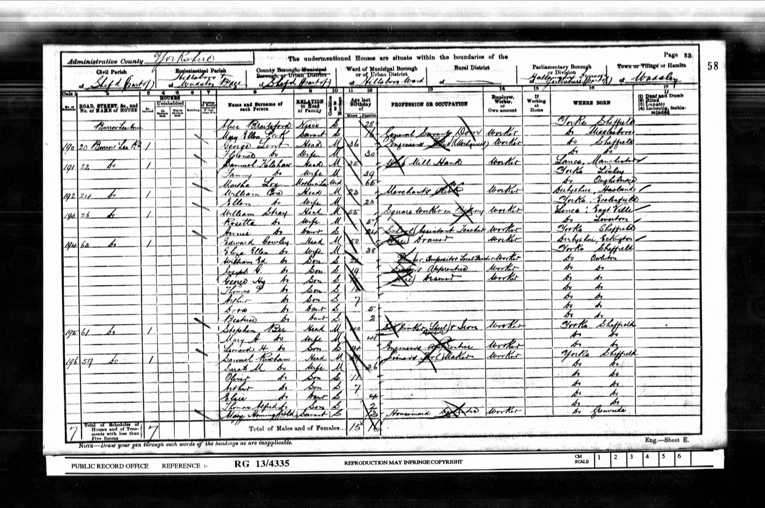 1911 brings a change in Samuel’s trade and the family address, now they lived at 366, Fulwood Road, Sheffield, with 5 rooms. Samuel, 49, was now a Fruiterer & Florist and he tells us that they had been married 23 years, while Sarah Maria, 46, tells us that 6 children had been born and sadly 1 died. Oliver, 21 and single was a Grinder (Saws), Arthur,18, was a Shop Assistant, Elsie, 14 and Winifred, 5, are not at School, while Thomas Alfred, 12, is.