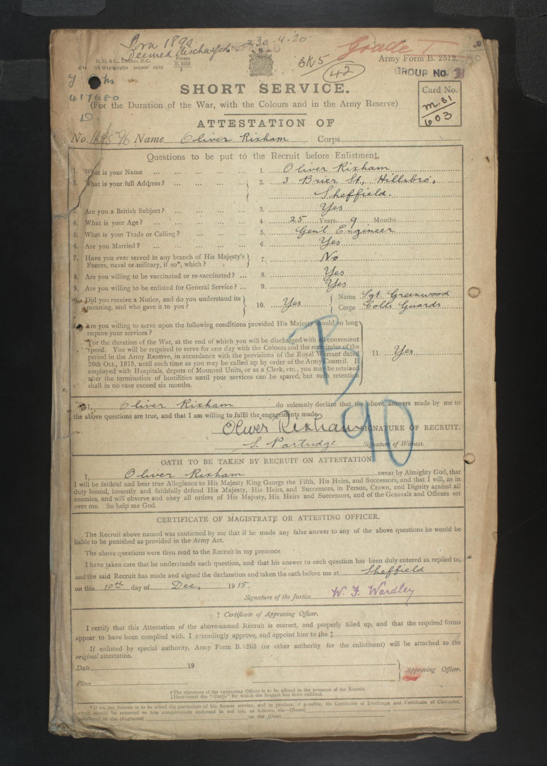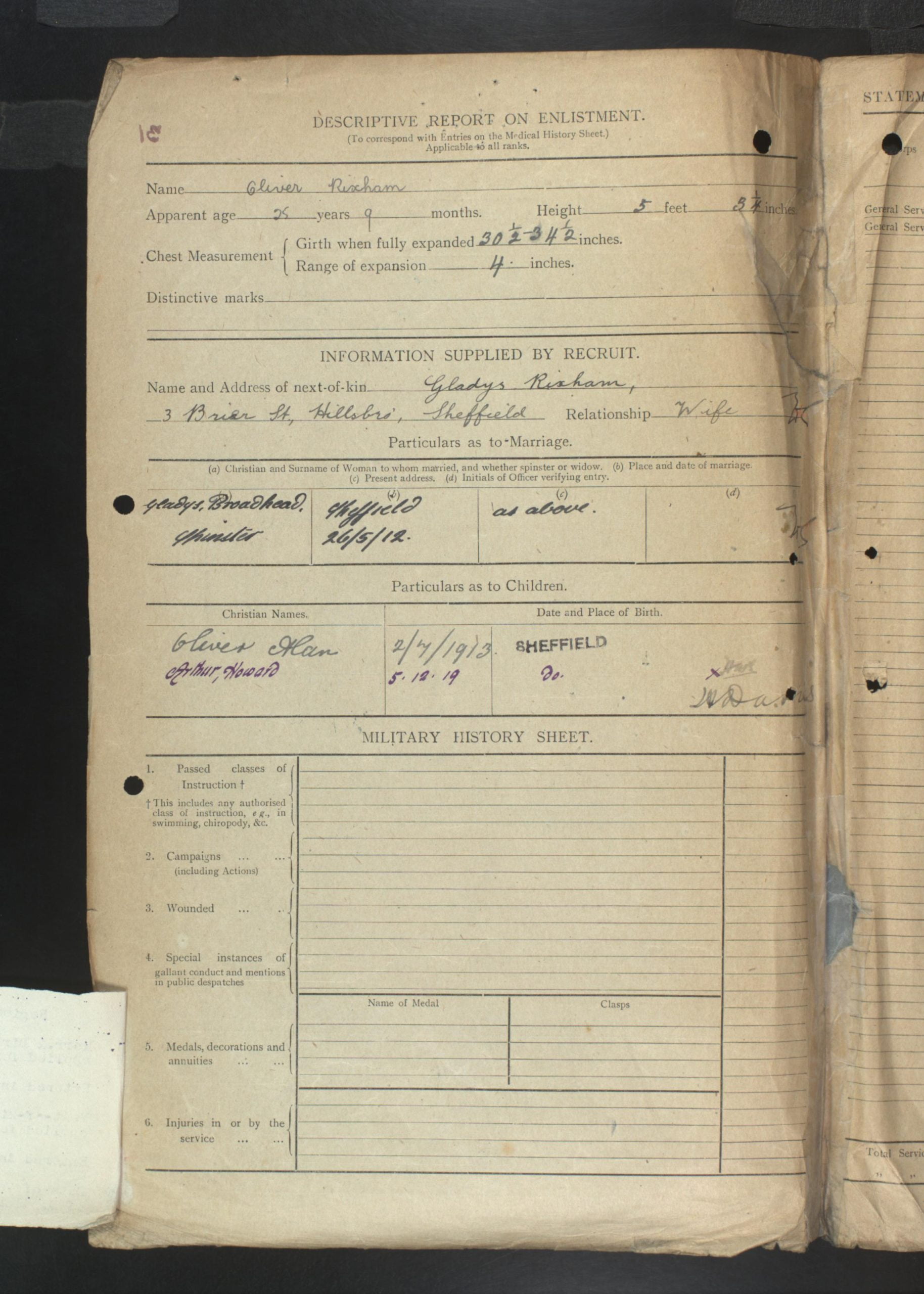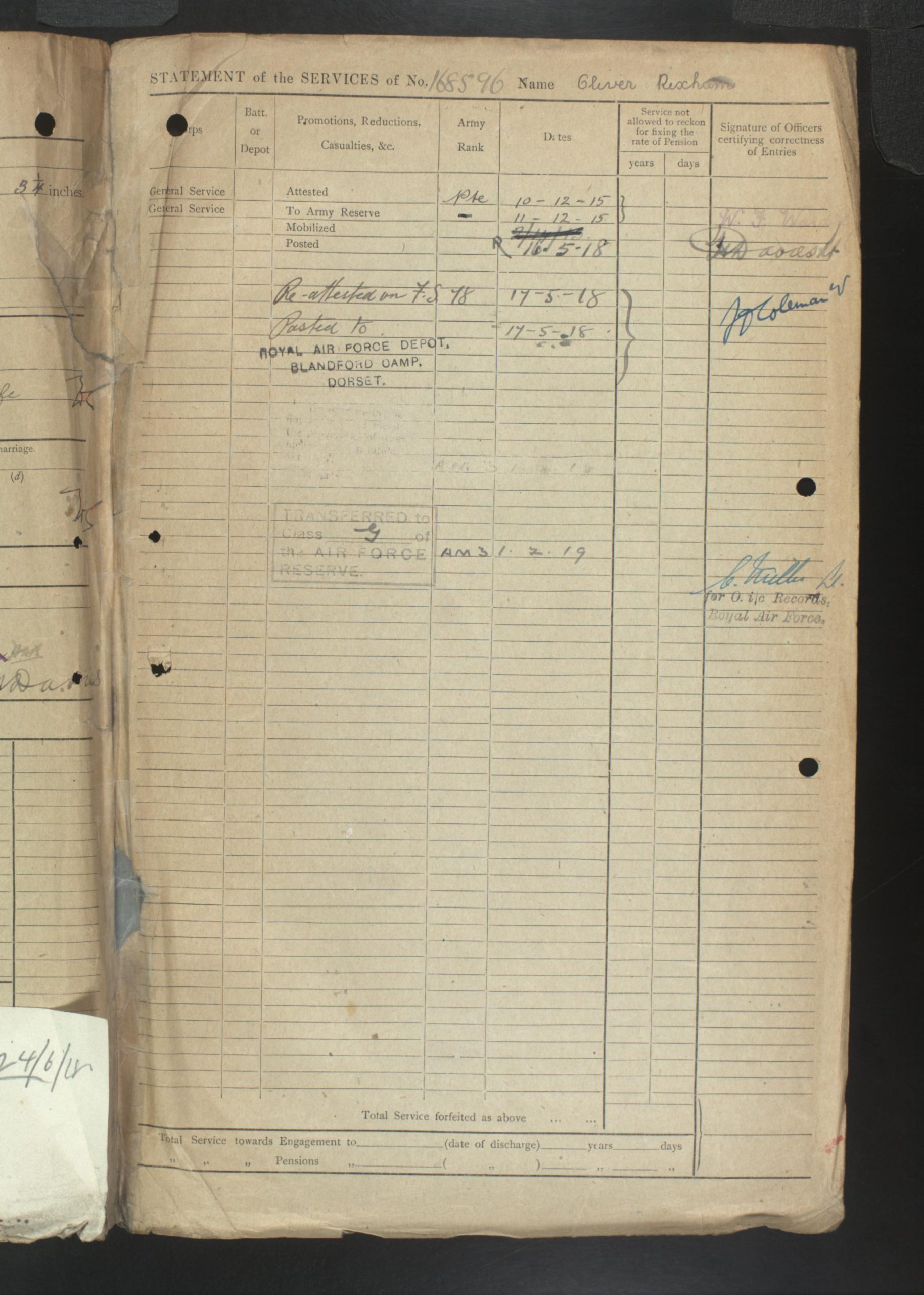 On the 10th of December 1915 Oliver enlisted in the Army, his Service No. was 168596, Grade 1. His Short Attestation sheet does not give the Regiment or Corps, but there is a description of him: He was 25 and 9 months old, his height was 5 feet 3 and ¼ inches and his chest measurement was 34and ½ inches when fully expanded. This source also gives his Trade or calling as General Engineer and address as 3, Brier St., Hillsbro., Sheffield, his wife as Gladys Rixham, and his marriage date as the 26th of May 1912. Their children were Oliver Alan born the 2nd of July 1913 and Arthur Howard born the 5th of December 1919. Oliver was re-attested on the 17th of May 1918 and posted to the Royal Air Force Depot, Blandford Camp, Dorset. On the 1st of February 1919 he was transferred to the Air Force Reserve – Class G. He was “Deemed discharged” on the 30th of April 1920.