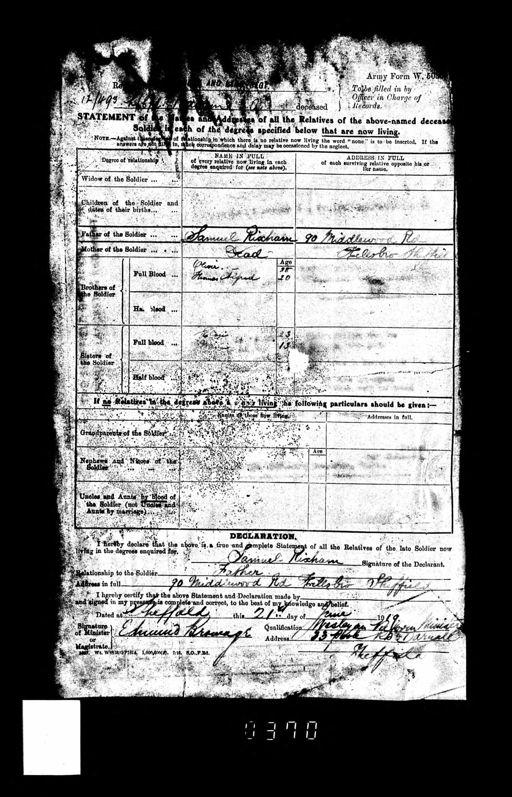 Oliver’s younger brother Arthur enlisted in 1914 when the war was declared, his Service No. was 12/493 and he was a Lance Corporal (Unpaid) in the 12th Bn. York and Lancaster Regiment, he gave his age as 21 years and 332 days and he was a Shop Assistant. His service Records, which I have if anyone wants them, tells us that his father – Samuel RIXHAM, lived at 90 Middlewood Rd., Hillsbro, Sheffield. His Full blood Brothers were – Oliver age 28 and Thomas Alfred age 20 and his Full blood Sisters were – Elsie 23 and Winnie 13. It also tells us that he hadn’t resided out of his father’s house for three years.