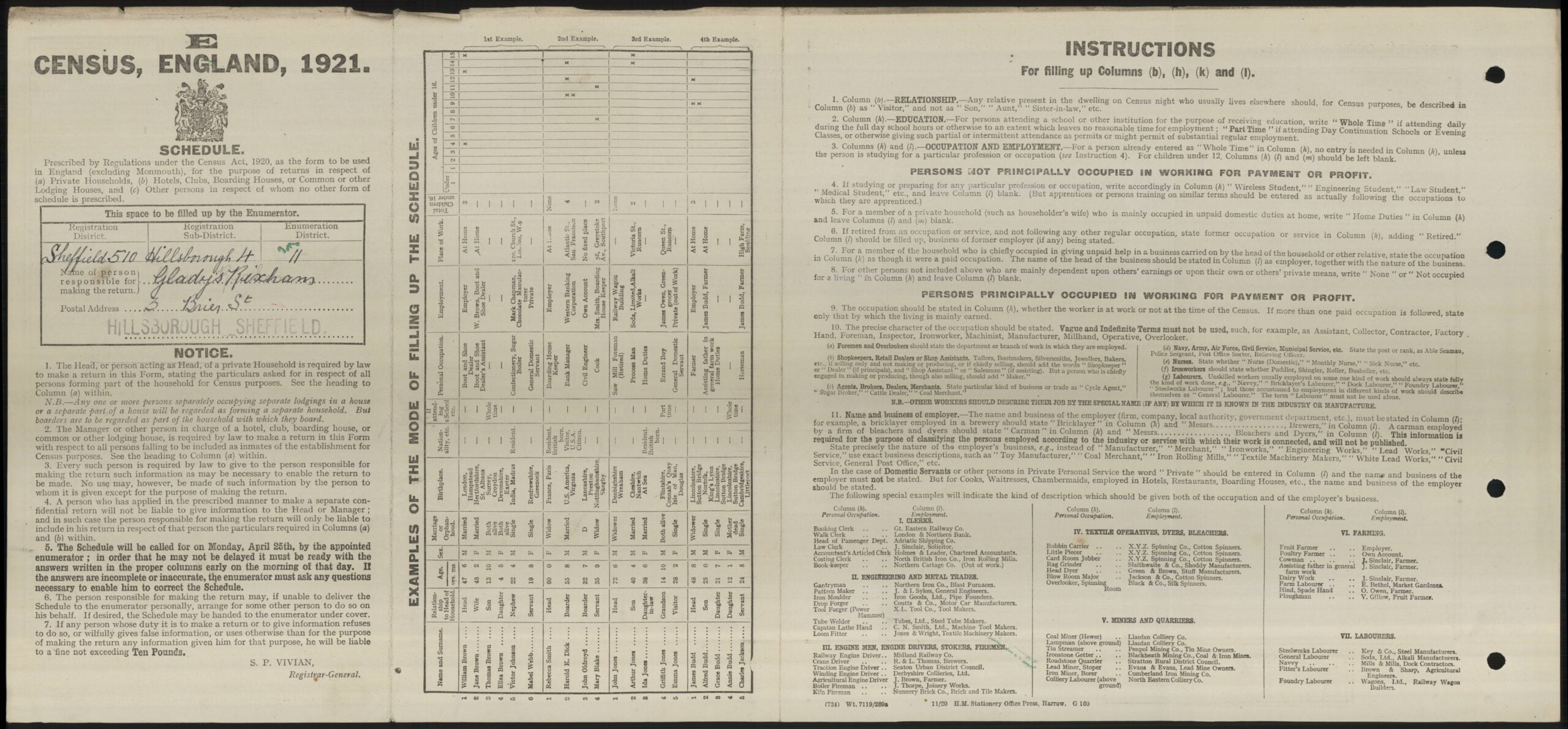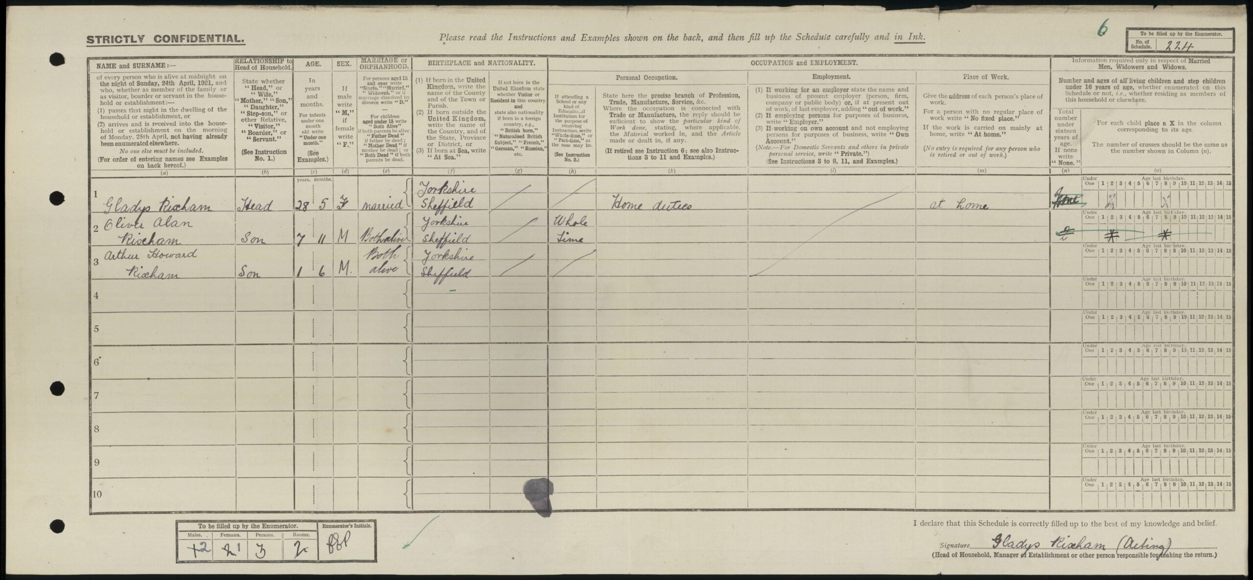 The 1921 census shows Gladys Rixham and two children living at 3, Brier Street, Hillsborough, Sheffield, Yorkshire (West Riding). Oliver Rixham is not there – where was he, as he had been ‘Deemed Discharged’ on the 30th of April 1920. Gladys Rixham is 28 years and 5 months old and, she was doing ‘Home Duties. Her children wee Oliver Alan Rixham, 7 years and 11 months old, and Arthur Howard Rixham, 1 year and 6 months old, they had all been born in Sheffield, Yorkshire. Gladys signed the census form, with (Acting) after her name.