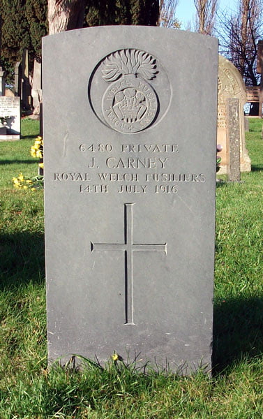 “On July 14th 1916, Private John Carney, Aged 46, of 12th Battalion RWF, was found dead at Kinmel Camp. The deceased had been found lying on his face, with no suspicious circumstances said to have surrounded his death. A subsequent post mortem examination revealed that his death was due to a natural cause, namely heart failure. Private Carney was born in Carrick Castle, Sligo, Ireland, and had been employed in the Mold area as a general farm labourer. ”