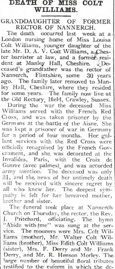 Louisa and Edith were still at Manley Hall on the 1911 census, which had 20 rooms. David Archer Vaughan Colt-Williams was now 61 and tells us that he had been married 26 years, he was still a Barrister at Law. His wife Laura L.L. Colt-Williams, 59 tells us that 4 children had been born, but 1 had died. Edith Laura was 24, and single, Louisa Constance, 22 also single. There were 4 servants in the household.
