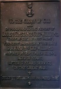 Louisa’s service record doesn’t survive and there is no entry in the “Soldier’s Effects Register for her. An undischarged soldier or VAD nurse would normally be recorded in this register if they died in service. Although the Memorial says that Nurse Colt-Williams died in 1921 after “5 years service in the Great War” it doesn’t confirm dates of service.