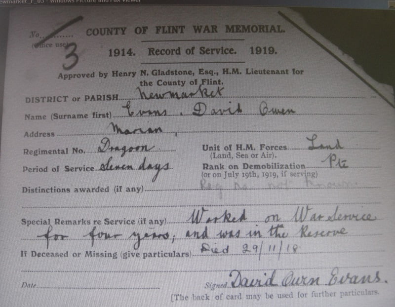 David Owen Evans is not named on the Trelawnyd War Memorial. However an index card in the Flintshire Record Office provides a record of his death during the First World War.