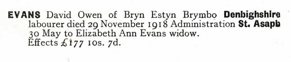 A probate reference for a David Owen Evans exists….. If this is the same man, it states that he left his estate of £177 10s 7d to his widowed mother.