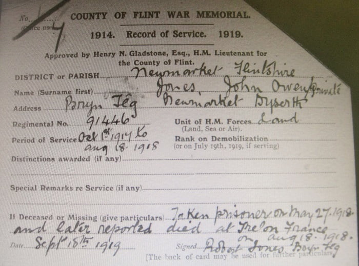 His father wrote on the index card (held in the Flintshire Record Office): “Taken prisoner on May 27th 1918 and later reported died at Trelon, France on 18th August 1918”
