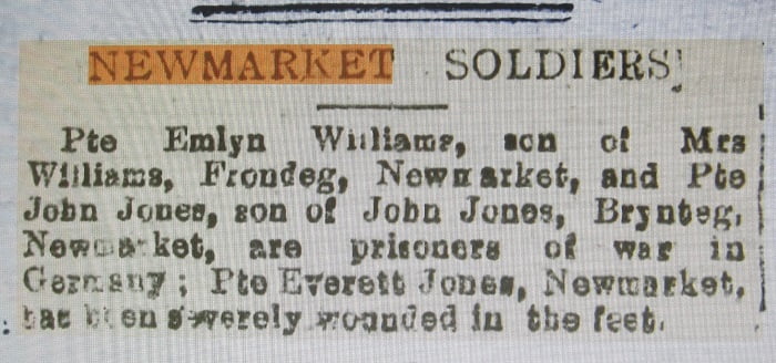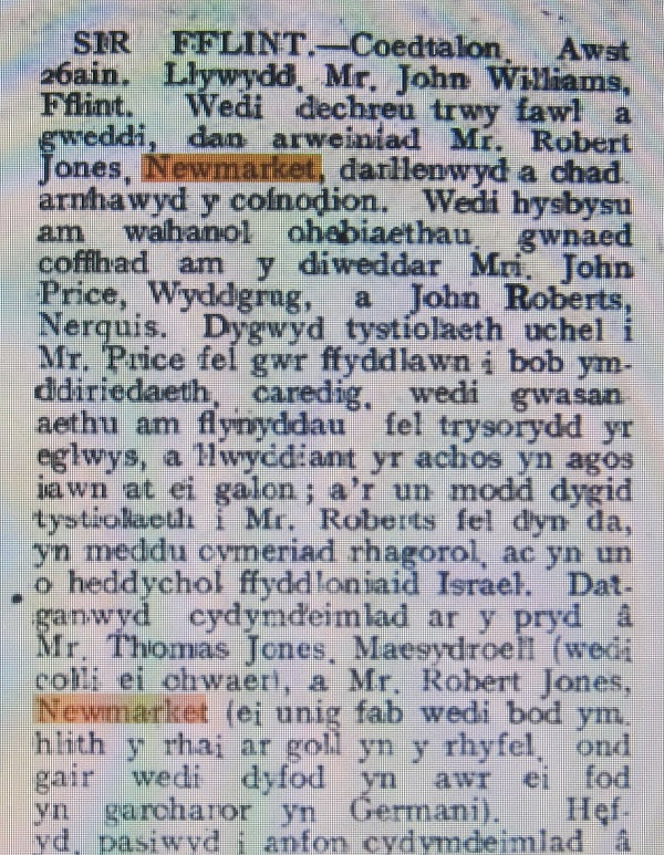 The newspaper account states that the meeting in Coedtalon began with worship and prayer after which Robert Jones, Newmarket, read out the notices. During the meeting sympathy was extended to Robert whose only son had been among those lost in the war but now word had reached him that he was a prisoner in Germany.