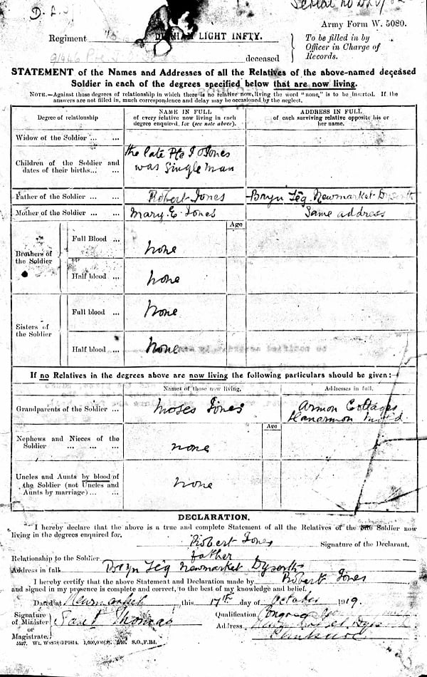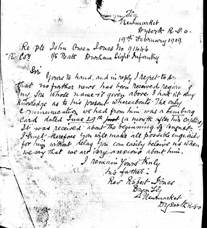John Owen Jones was born in Llannefydd, Denbighshire at the turn of the century. He was the only child of Robert and Elizabeth Ann Jones. They were Welsh speakers, both of whom came from the same area. According to the census, in 1901 Robert was a minister with the Calvanistic Methodists and living in Llannefydd. By 1911 the family had moved to Trelawnyd (Newmarket) where Robert continued his ministry. John, aged 11, was at school.
