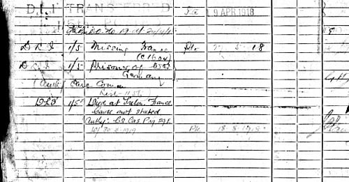 He was 18 when he joined up. Many of his service records have survived and can be accessed via Ancestry. From these we know that he was employed as a shop assistant when he enlisted in October 1917. He was first recruited into the 5th Reserve Battalion, The King’s Liverpool Regiment. In February 1918 he was transferred to the 4th Reserve Battalion, Royal Welsh Fusiliers and in April of that year he was posted to France. There he was transferred again, this time to the Durham Light Infantry. A short time after, at the end of May, his battalion was reported missing in the field.