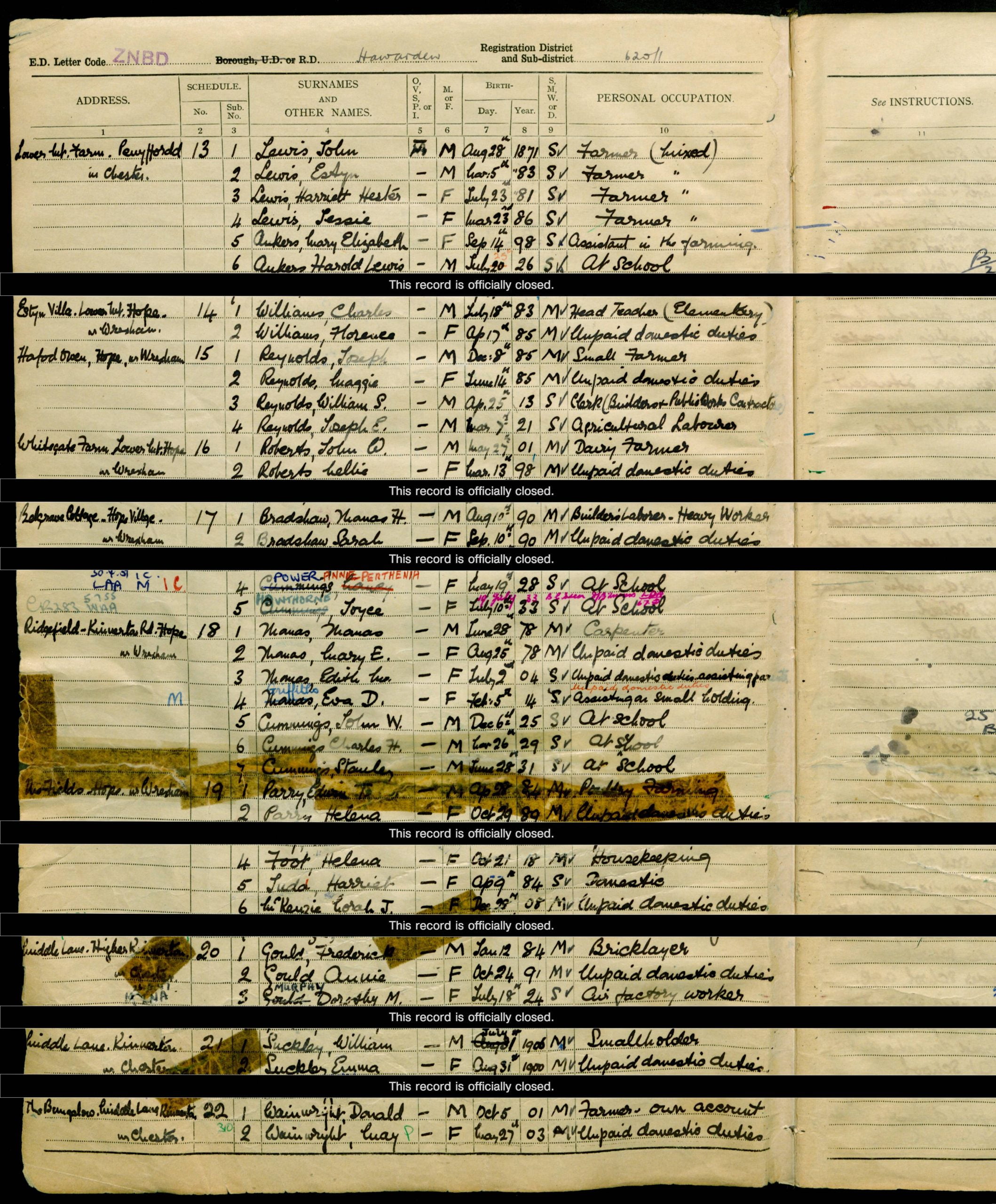 The 1939 National Register (Taken on the 29th September 1939) shows the family living at Haford Owen, Hope, Wrexham, Penyffordd, Hawarden, Flintshire, Wales. This address is rather confusing as Penyffordd is in the Parish of Hawarden, Flintshire, but close to the border with Wrexham, so I don’t know how the authorities managed to put Wrexham in the address, but that is how “Find my Past” have transcribed it. This source gives us dates of birth, which is helpful. Joseph Reynolds had been born on the 8th of December 1885 and was described as a Small Farmer. Maggie Reynolds had been born on the 14th of June 1885 and as most married women on this register ,who did not have a job, was described as doing “Unpaid Domestic Duties.“ William S. Reynolds had been born on the 25th of April 1913 and was a Clerk (Builders & Public Works Contractor). Joseph E. Reynolds had been born on the 7th of March 1921 and was an Agricultural Labourer.