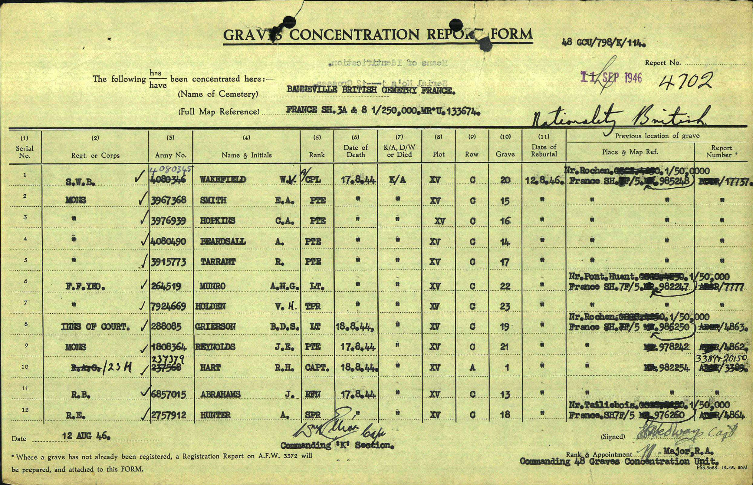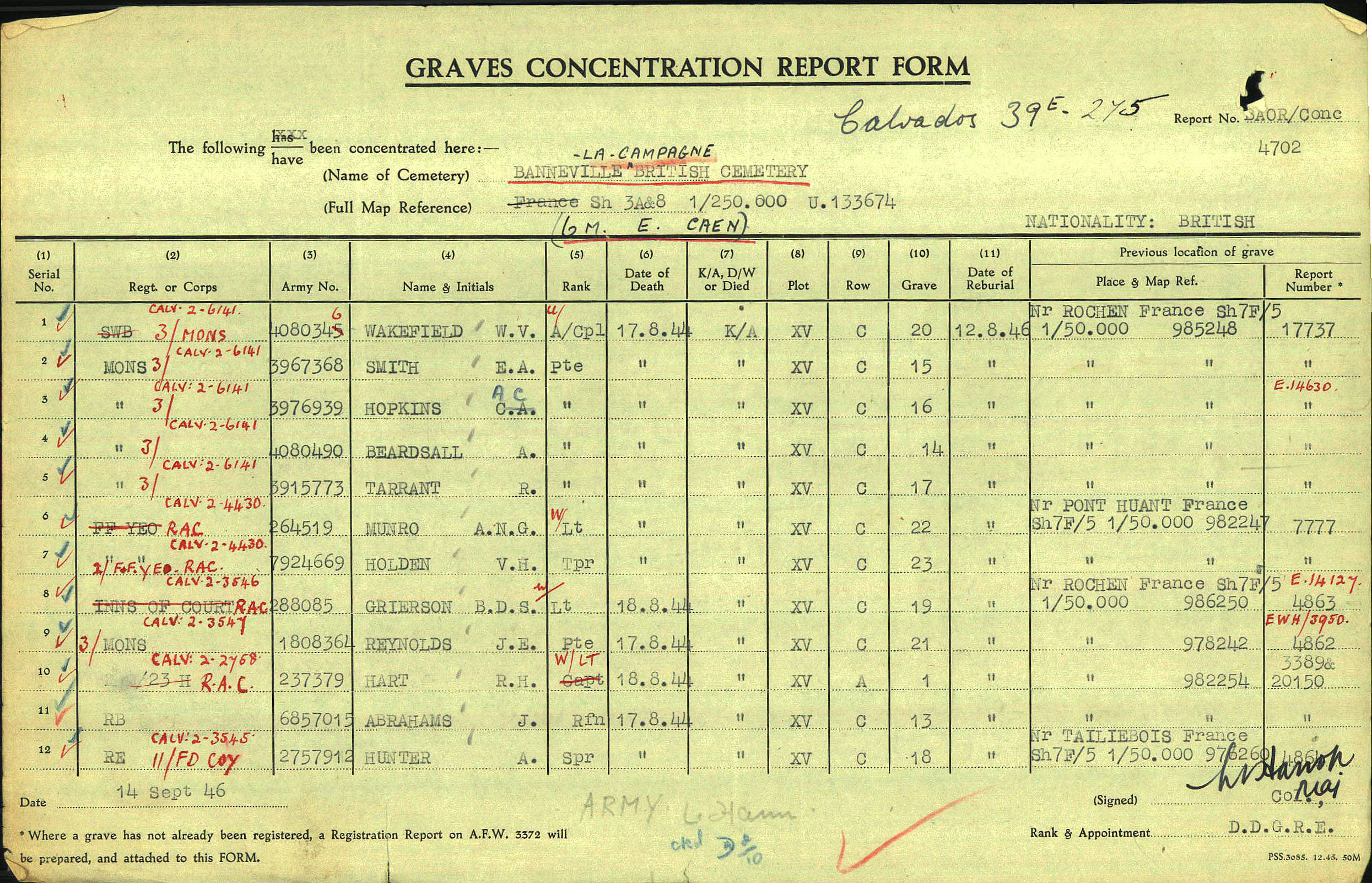 When Joseph Edward was killed he was buried, probably near where he died, near Rochen, France, the CWGC give the co-ordinates – Sh7F/5 1/50.000 986242. Then he was reburied on the 12th August 1946 at Banneville-La-Campagne War Cemetery.