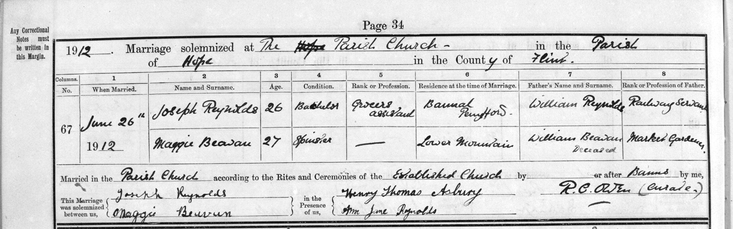 Joseph REYNOLDS, 26, Bachelor, Grocer’s Assistant, Bannel, Pennyfford, William REYNOLDS, Railway Servant & Maggie BEAVON, 27, Spinster, Lower Mountain, William BEAVON (Deceased), Market Gardener. (After Banns).