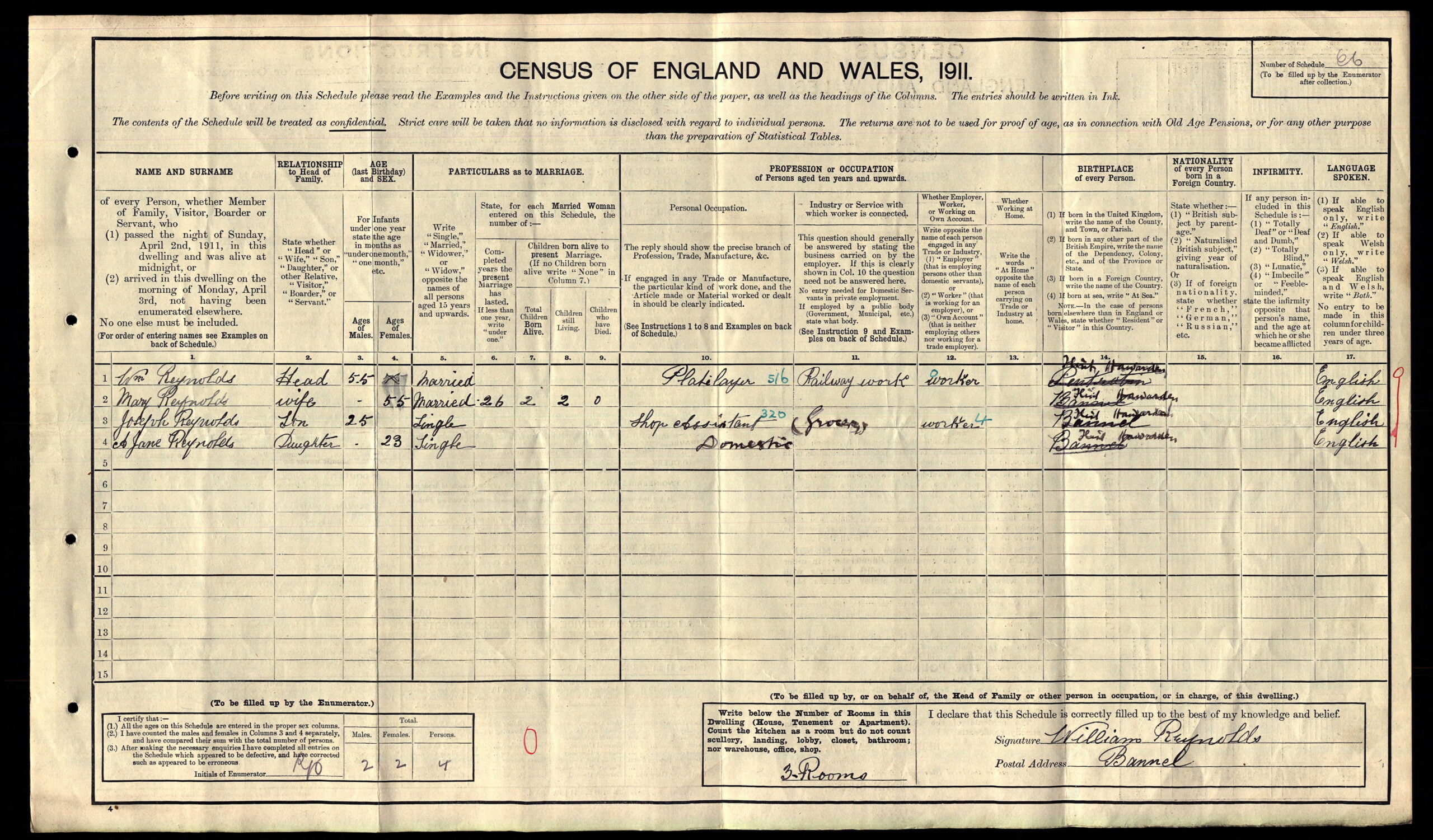 Joseph Reynolds is seen on the 1911 census living at The Bannel, Mold, Flintshire, with his family. His father, William Reynolds, 55, was head of the household and a Platelayer (Railway), his mother was Mary Reynolds, 55, and they tell us that they had been married 26 years and 2 children had been born to them and were still living. Their only son, Joseph Reynolds, 25, was a Shop Assistant and was single. Their only daughter, Ann Jane Reynolds, 23, and single was a Domestic. They had all been born in Hawarden according to the census, although on the 1891 census, William had been born in Pentrobin, Flintshire and the others born in Bannel.