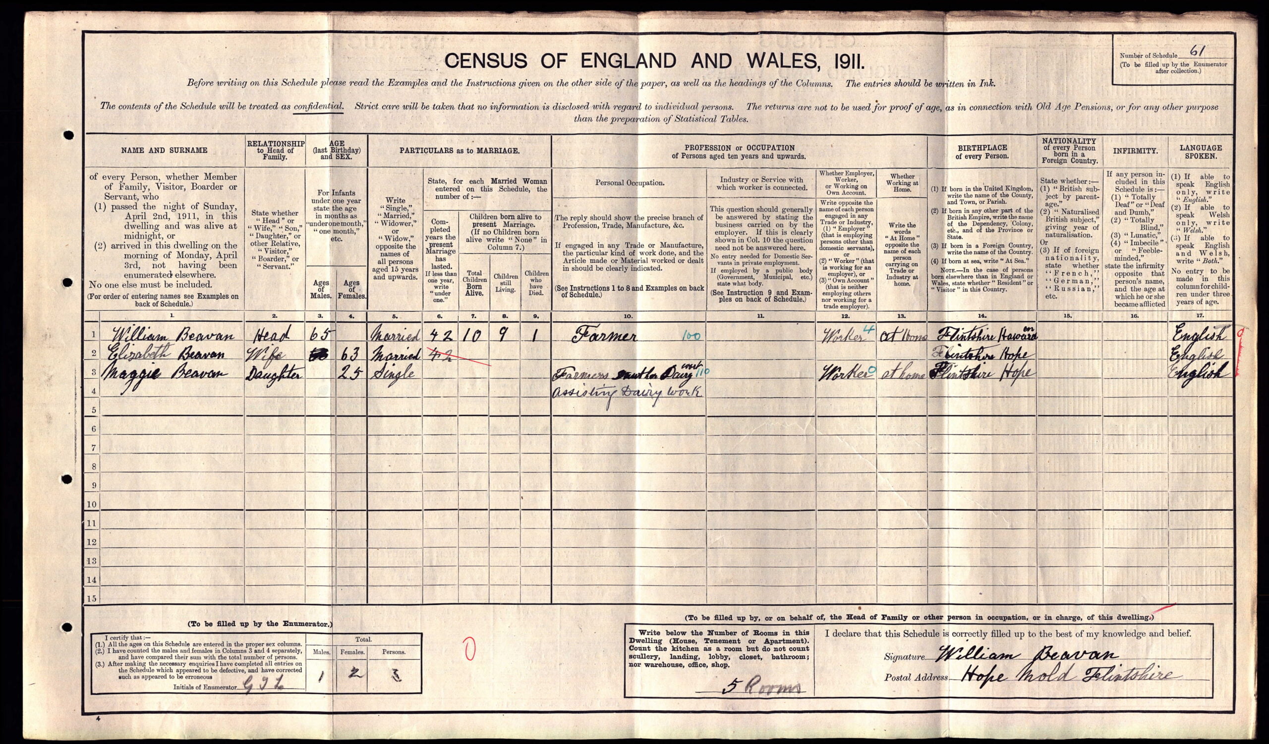 Maggie Beaven is also seen on the 1911 census, living with her parents at Lower Mountain, Hope, Nr. Mold (5 rooms). Her father William Beaven, 65, is head of the household and he was a Farmer, born in Hawarden, Flintshire. Her mother, Elizabeth,63, tells us that they had been married for 42 years and 10 children had been born, but sadly 1 died. Maggie, 25, was single and a Farmer’s daughter assisting Dairy Work. Both Mother and daughter had been born in Hope, Flintshire.
