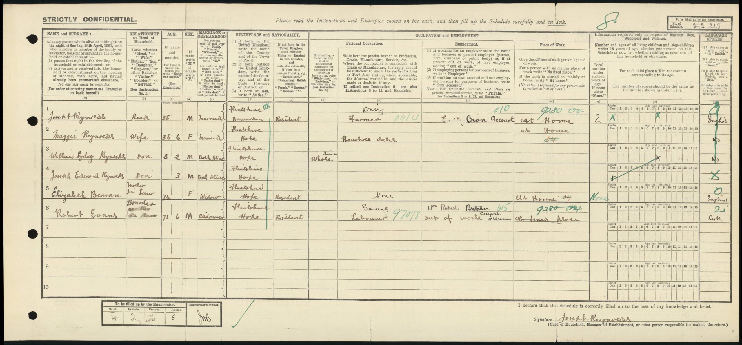 The 1921 census, which was taken on the 19th of June 1921, shows the young family living at Maggie Reynold’s (nee Beavan) family home at Lower Mountain, Hope. Joseph Reynolds was Head of the household and was age 35 years, he had been born in Hawarden, Flintshire and was a Dairy Farmer on his own account at home. Maggie Reynolds was 36 years and 6 months old born in Hope, Flintshire and was doing ‘Home Duties.’ Their eldest son, William Sydney Reynolds was 8 years and 2 months old, Joseph Edward Reynolds was just 3 months old, both born in Hope, Flintshire. Maggie’s mother, Elizabeth Beavan was 74 years old and a widow. Robert Evans, a Boarder, and widower was 71 years and 6 months old. He was a General Labourer for Wm. Roberts, Butcher, Caergwrle, Nr. Wrexham, but was ‘Out of Work.’