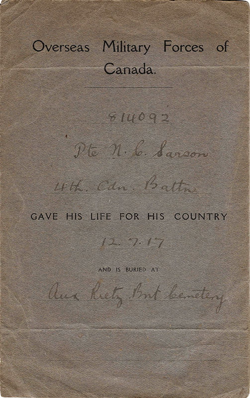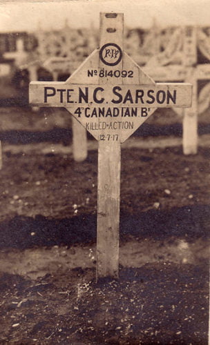 On the 12th July 1917, whilst “in the trenches at Vimy”, Noel was killed in action [Canadian War Graves Register {Ancestry}. He was 20 years old. The Casualty report was addressed to; Mr & Mrs Sarson, Odyn House, Rhuddlan. [Ancestry]