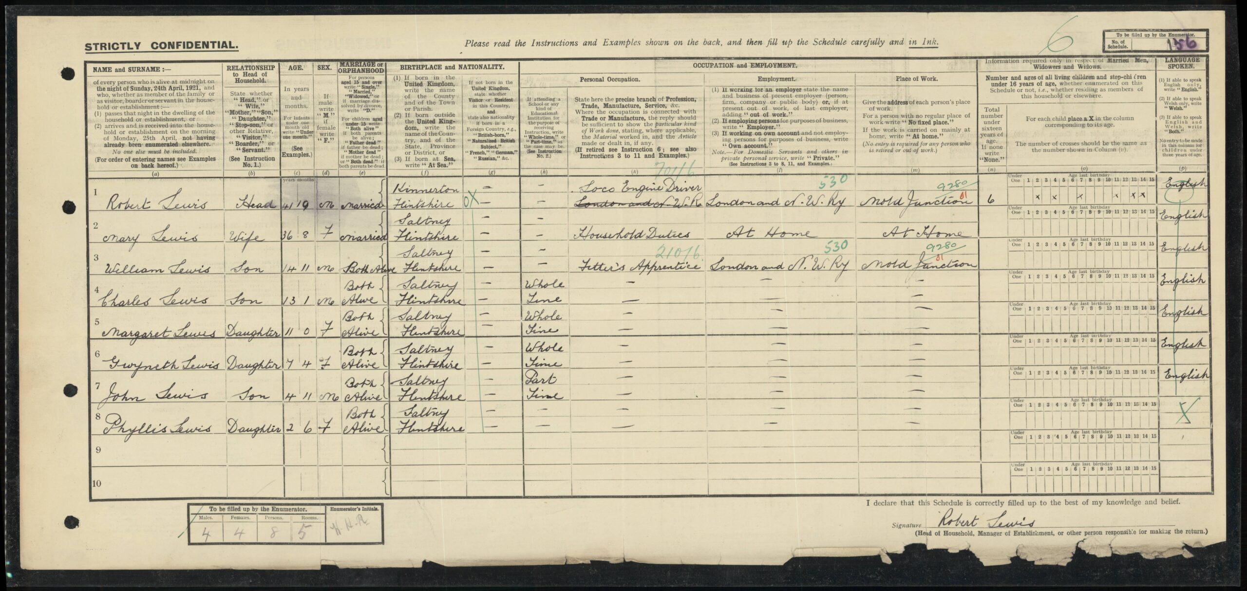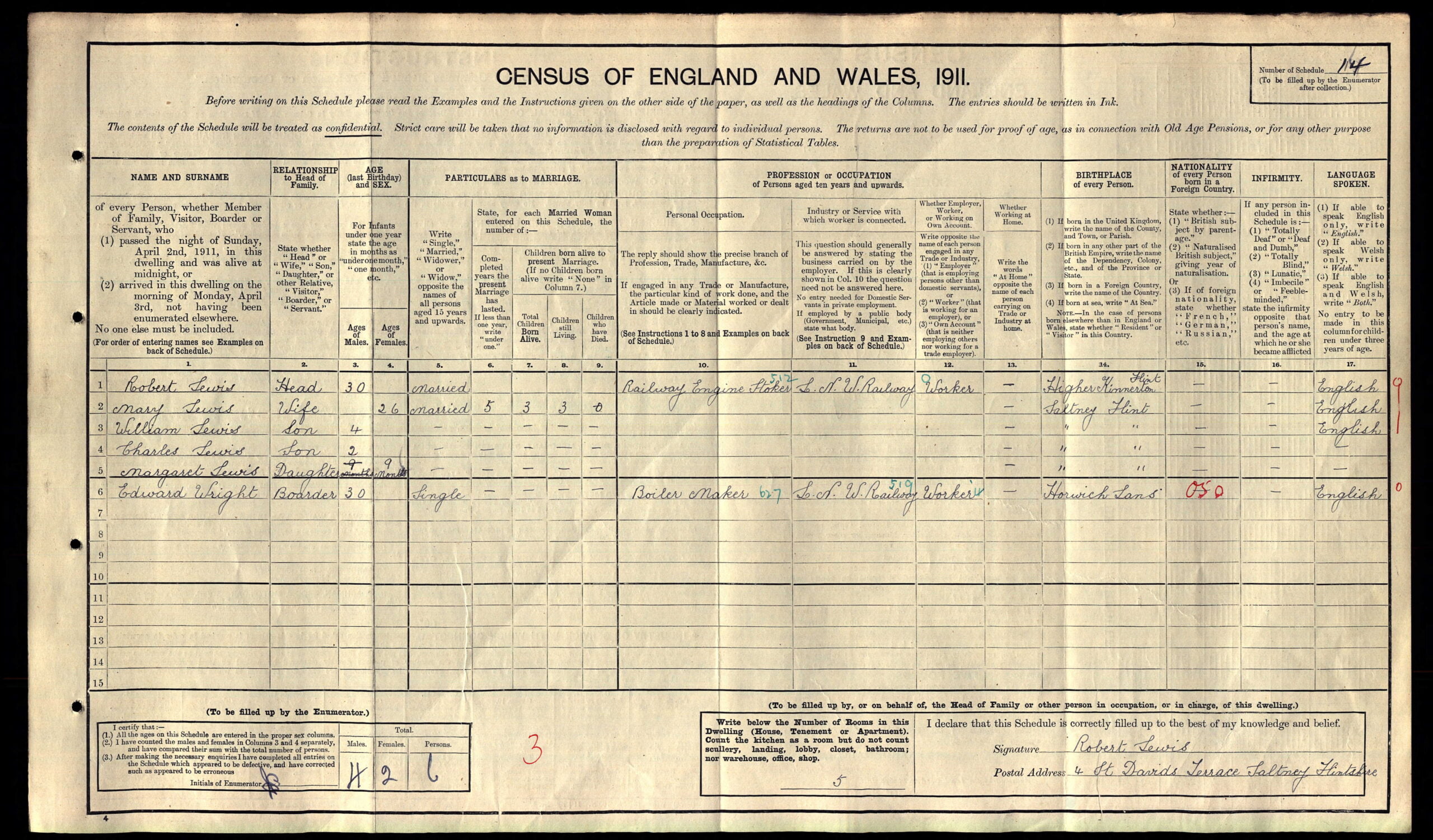 They are first seen on the 1911 census living as a family, at 4, St. David’s Terrace, Saltney, Flintshire, which had 5 rooms. Head of the household was Robert Lewis, age 30, a Railway Engine Stoker (L.N.W. Railway) born in Higher Kinnerton, Flintshire. His wife, Mary, 26, tells us that they had been married for 5 years and 3 children had been born, all still living. Their children were William, 4, Charles, 2, and Margaret, 9 months, all had been born in Saltney, Flintshire. There was a Boarder, Edward Wright, 30, single and a Boiler Maker working for the L.N.W. Railway, born in Horwich, Lancashire.