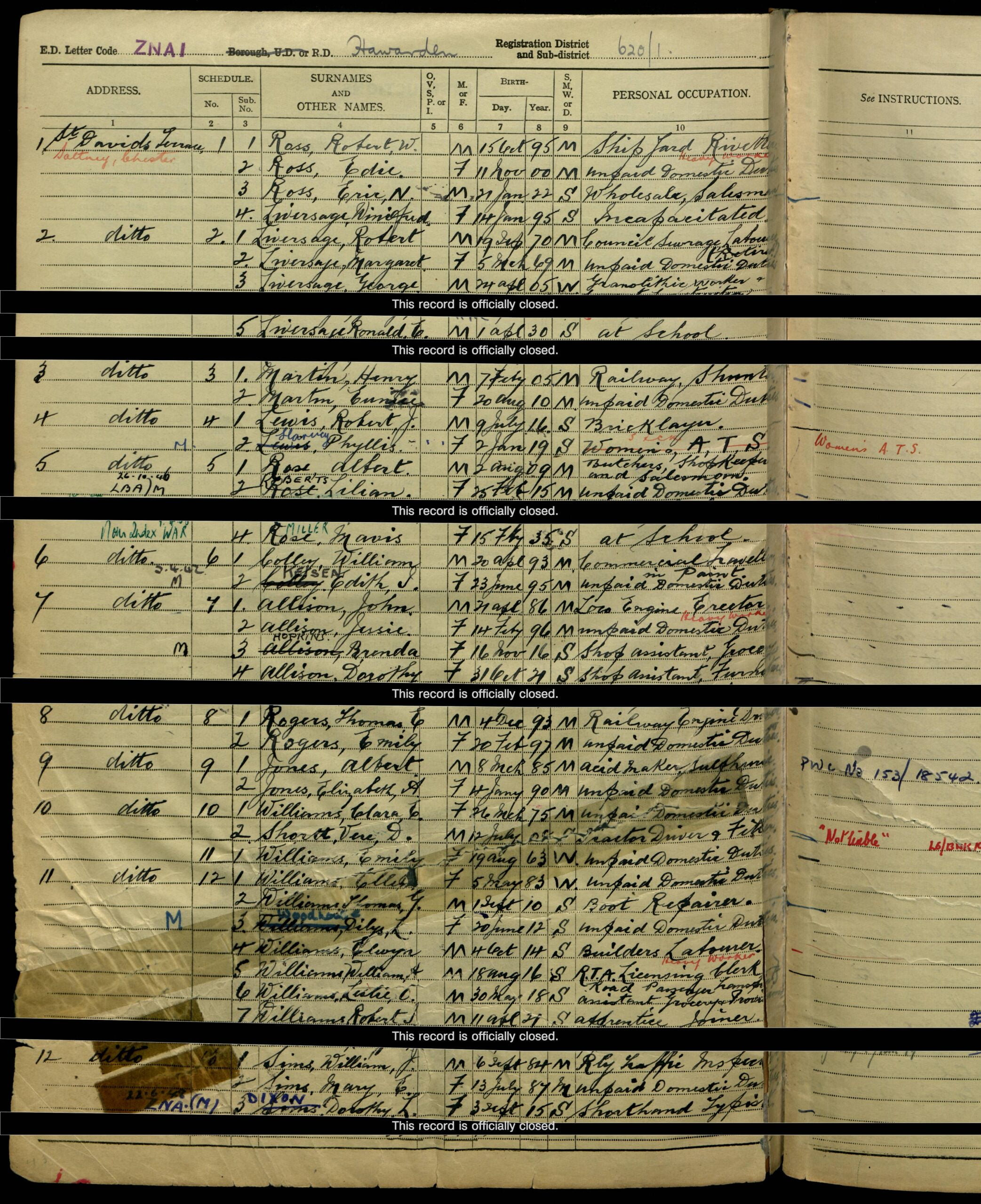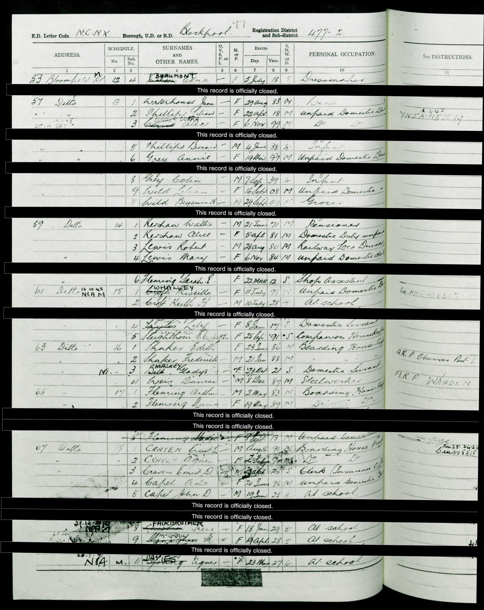 Robert John’s parents, Robert & Mary were living in Blackpool on the night of the 29th of September 1939, when the 1939 National Register was taken. Were they on holiday or had the moved because of Robert’s work on the Railway? They did move about a lot when they worked for the Railway company. They were staying at 59 Bloomfield Road, Blackpool, Blackpool C.B., Lancashire, in the household of Walter & Alice Kershaw and a Sarah E. Fleming. There was a redacted or closed record as well, but I don’t know who that was. This source tells us the dates of birth, Robert was born on the 28th of August 1880 and Mary on the 6th of November 1884. They also stated their occupation, Robert’s was a Railway Locomotive Driver and Mary was described as doing “Unpaid Domestic Duties,” as most married women who did not have a job was described on this Register.