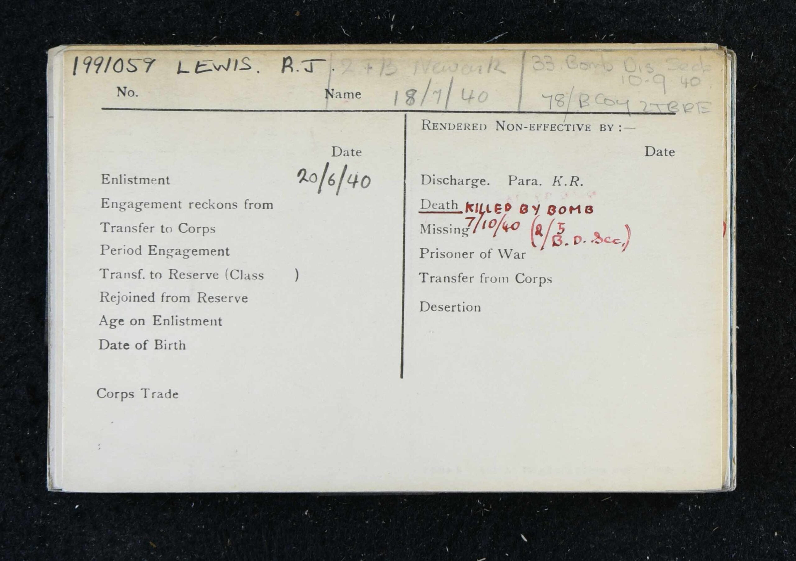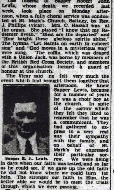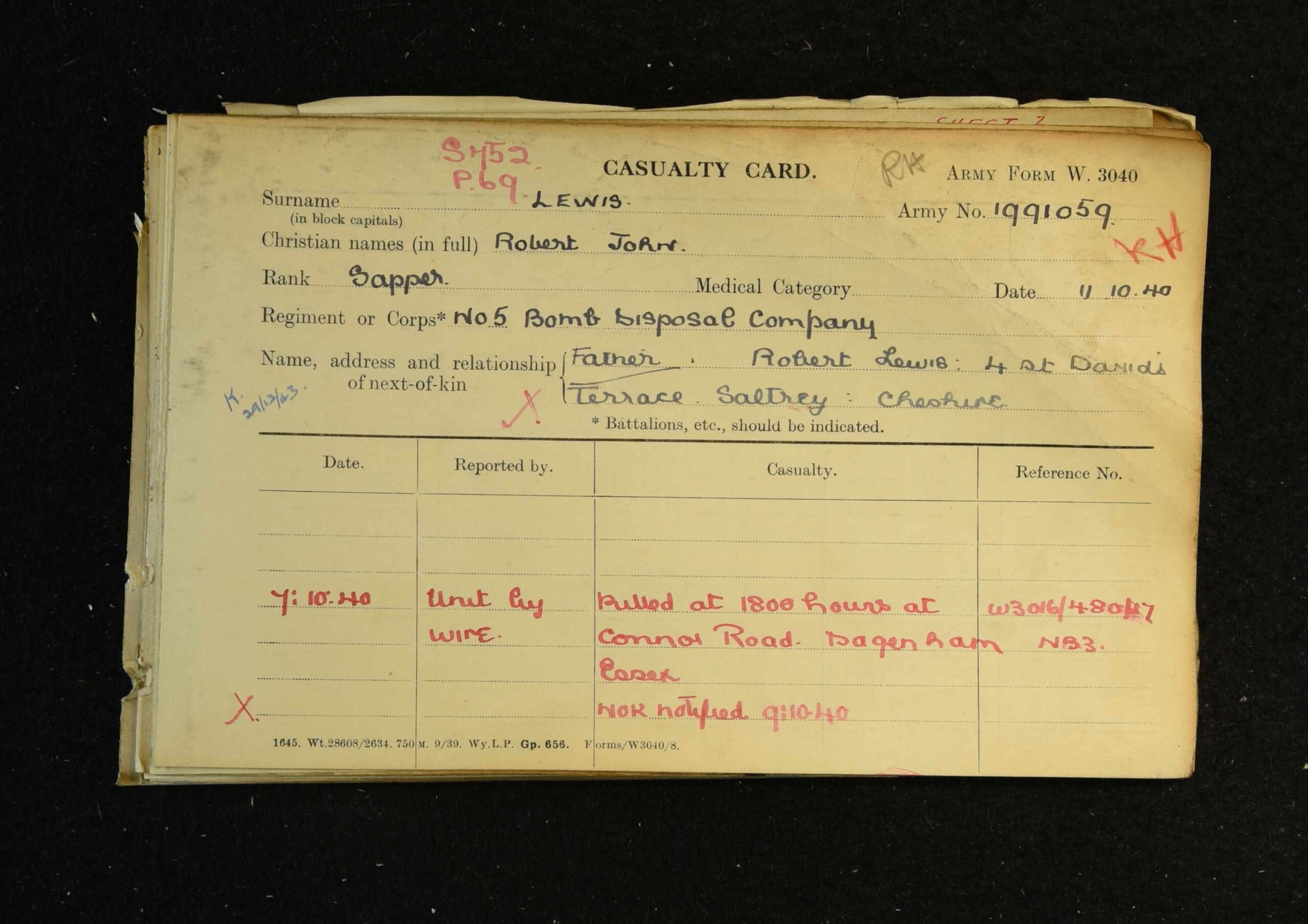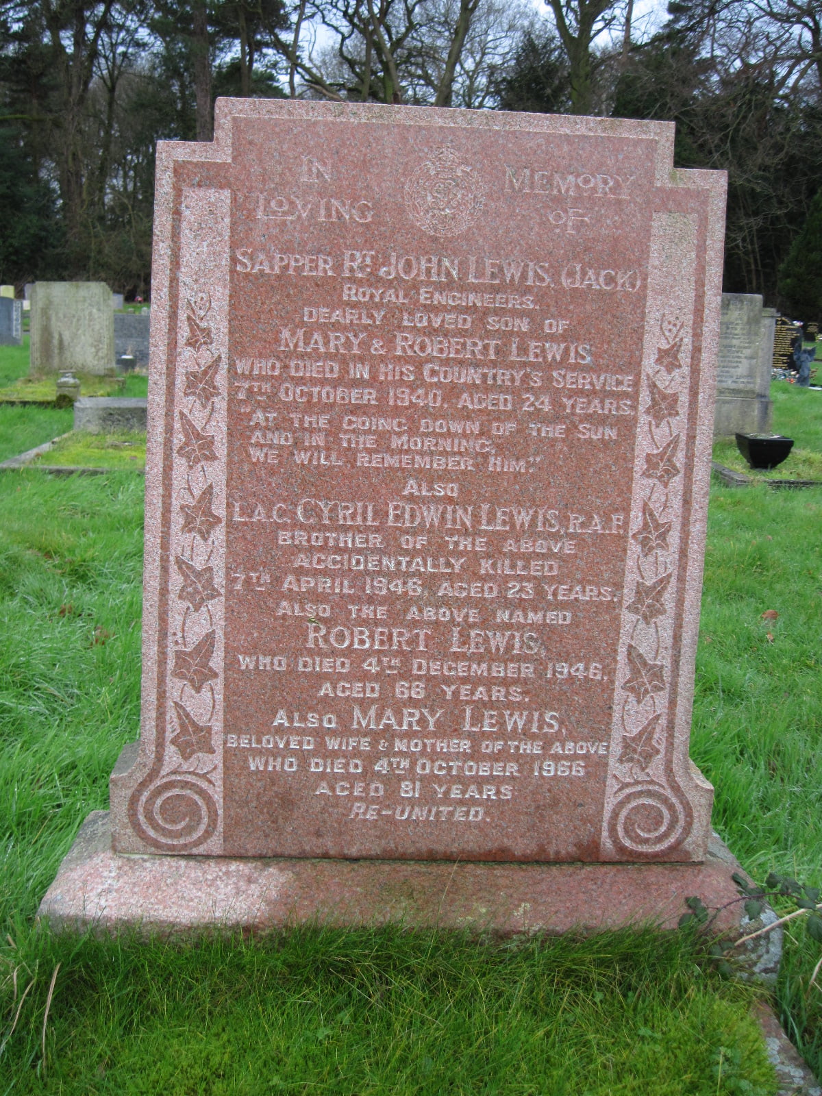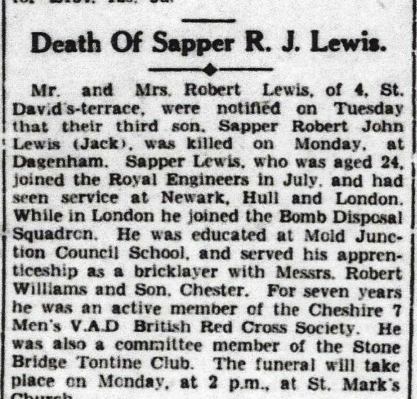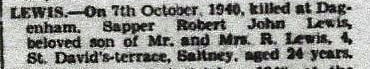 Deaths – LEWIS, – On 7th October 1940, Killed at Dagenham, Sapper Robert John LEWIS, beloved son of Mr. & Mrs. R. LEWIS, 4, St. David’s Terrace, Saltney, aged 24 years.