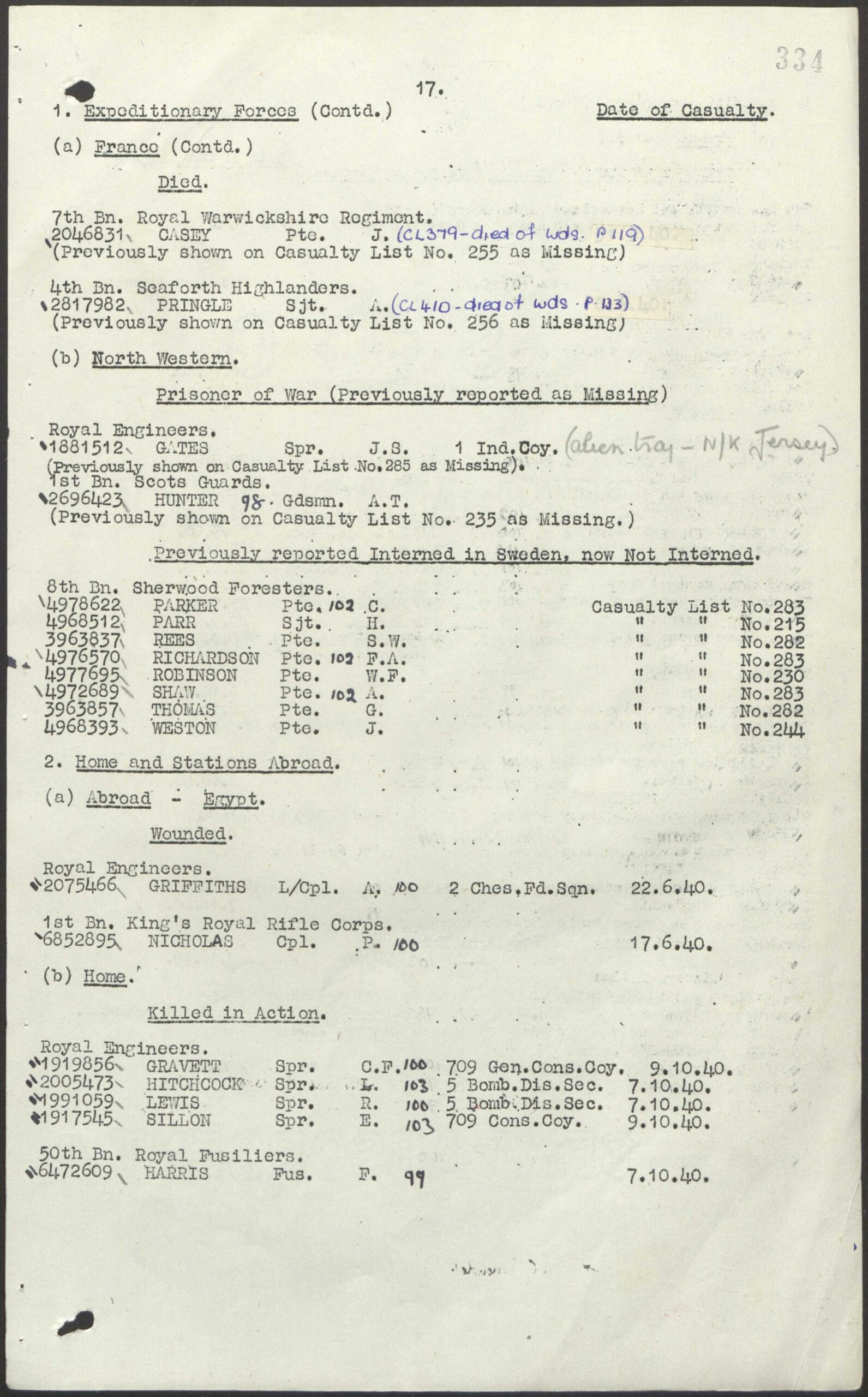 Casualty List 334 (page 17, Robert John is listed as “Killed in Action.”