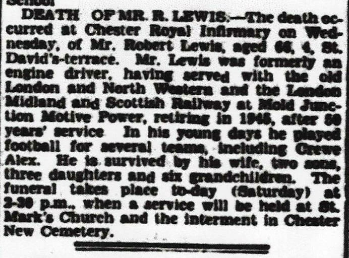 “He had been an engine driver and had worked for London and North Western, and London, Midland and Scottish Railway at Mold Junction Motive Power. He lived at 4 St David’s Terrace, Saltney, Chester. He retired in 1945. He died at Chester Royal Infirmary, aged 66 yrs. He was buried on the 7th December 1946. – (Source:- Cheshire Observer 7th December 1946)”