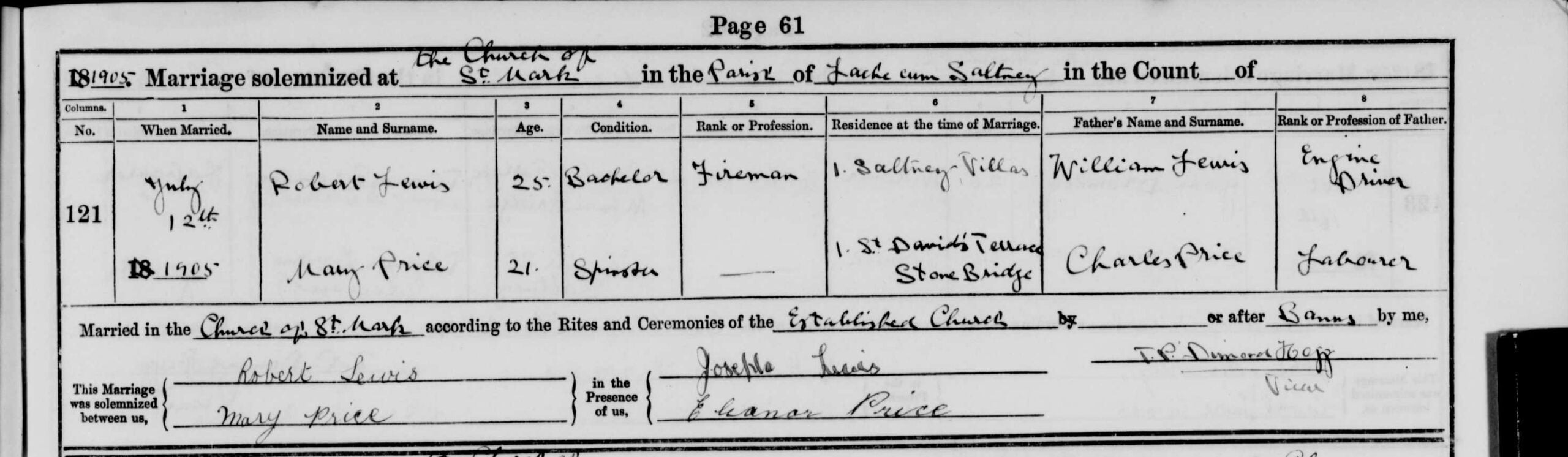 Robert John Lewis was born in the September quarter of 1916, (Hawarden Vol. 11b Page 366), the 3rd son of Robert & Mary LEWIS (nee PRICE) who had married on the 12th of July 1905 at St. Mark’s Church, Lache cum Saltney. Robert Lewis was 25, a bachelor and Fireman, his address was 1, Saltney Villas and his father, William Lewis, was an Engine Driver. Robert’s bride, Mary Price, was a spinster, age 21 years and her address was 1, St. David’s Terrace, Stone Bridge, Saltney. Her father, Charles Price was a Labourer. Their siblings, Joseph Lewis and Eleanor Price were their witnesses.