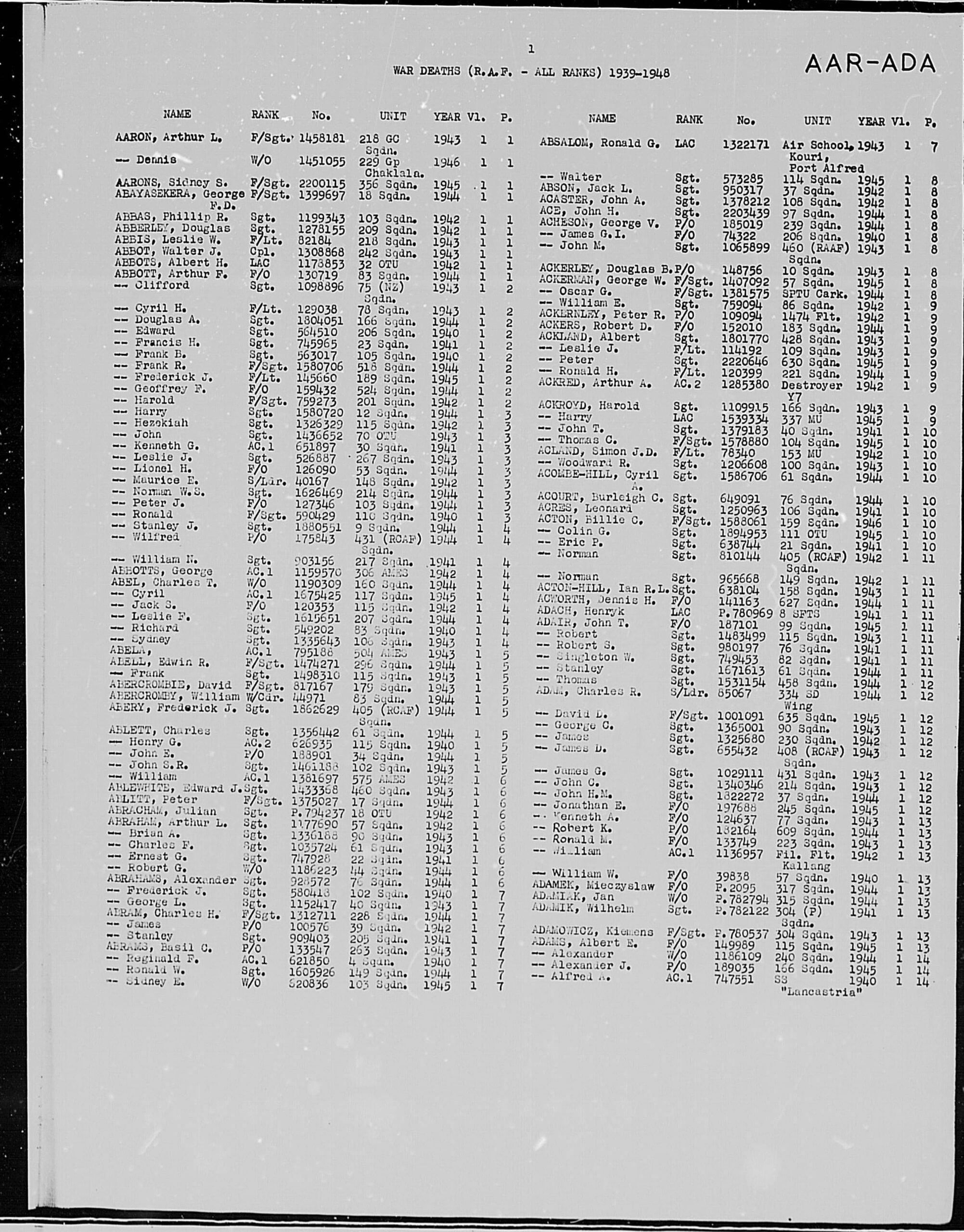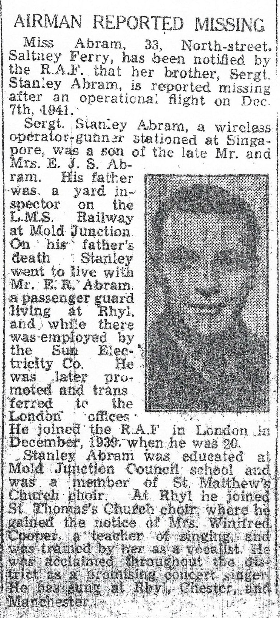 Miss ABRAM, 33, North Street, Saltney Ferry, has been notified by the R.A.F., that her brother, Sergt. Stanley ABRAM is reported missing after an operational flight on Dec.7th 1941.