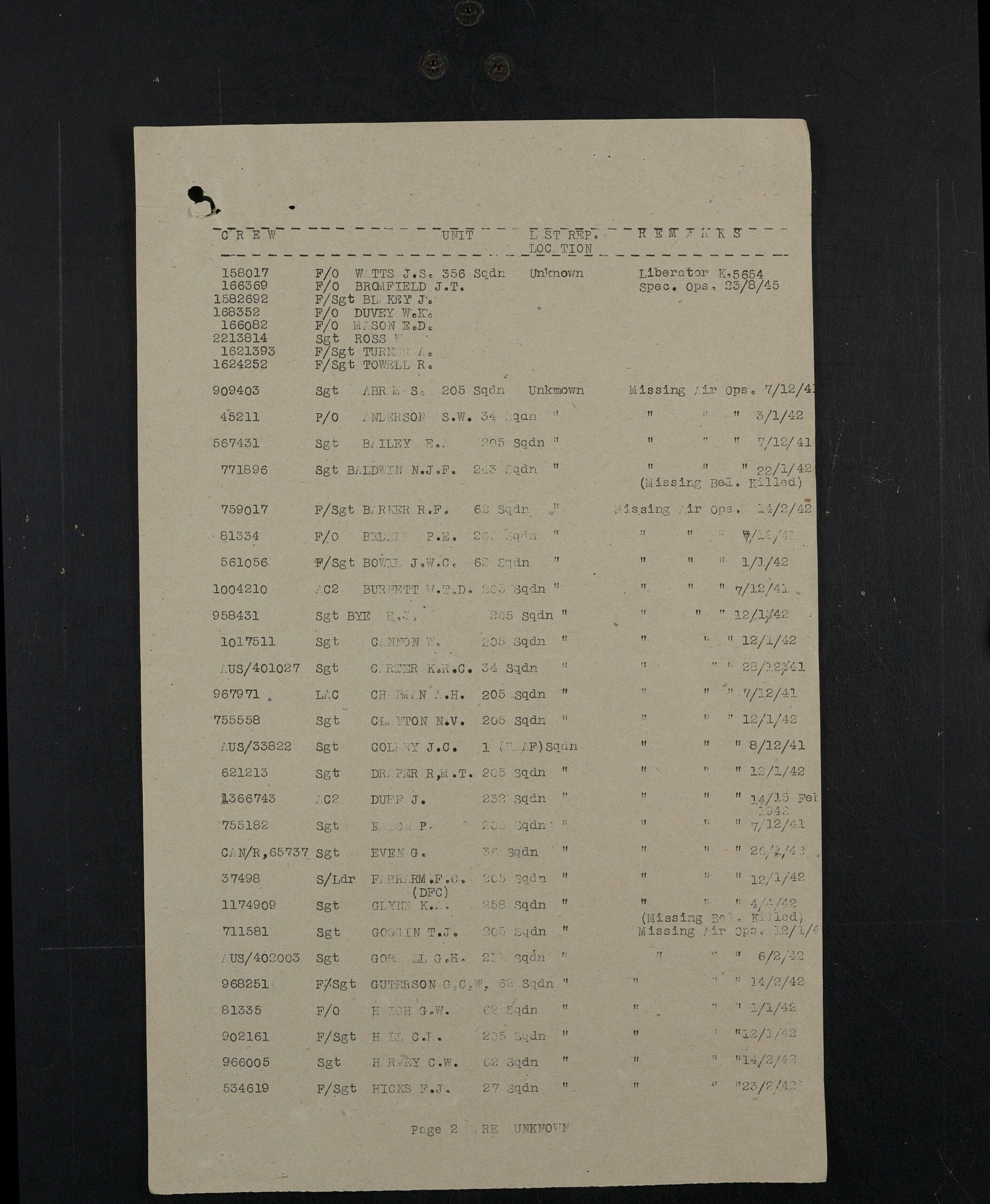Description: – Flying Officer P E Bedell, Flight Sergeant W E Webb, Sergeant C B Treloar (RAAF), Sergeant E A Bailey, Sergeant S Abram, Sergeant P Eaton, Leading Aircraftsman A H Chapman, Aircraftsman W T D Burnett: missing believed killed; aircraft failed to return from operational flight shadowing the Japanese Fleet off the coast of Indo-China, Catalina W8417, 205 Squadron, 7 December 1941. (Held by: The National Archives, Kew. Former reference in its original department: P 364453/41. Record opening date: 03 December 2019