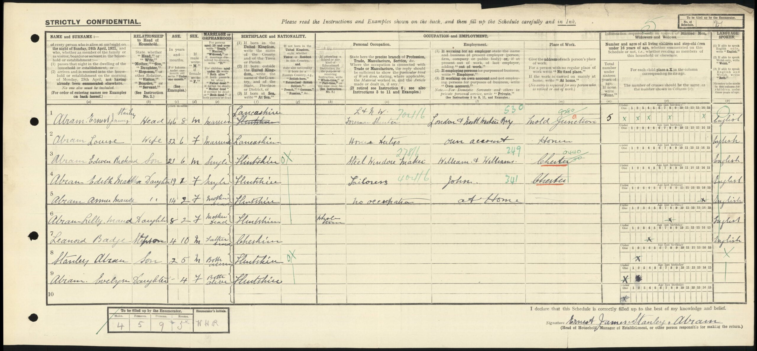 Ernest & Louisa had another child, Evelyn, in 1921 and they can all be seen on the 1921 census, still living at 33, North Street, East Saltney. Ernest James Stanley Abram, 46 years and 8 months old was a L & N W Foreman Shunter for the London & North Western Railway, Louisa Abram, 32 years and 6 months old, both had been born in Lancashire and Louisa was doing “Home Duties” (Own Account). Edwin Richard Abram was 21 years and 6 months old, single and a Steel Window Maker (William & Williams). Edith Matilda Abram, 19 years and 1 month old, was a Tailoress, Annie Maud Abram ,14 years and 2 months old, had no occupation (At Home). Lilly Maud Abram was 8 years and 2 months old. Stanley Abram, 2 years and 5 months old and Evelyn was a baby of 4 months. The children had all been born in Flintshire. Louisa’s son Leanord (sic) Badge, stepson to Ernest, was 4 years and 10 months old and had been born in Cheshire.