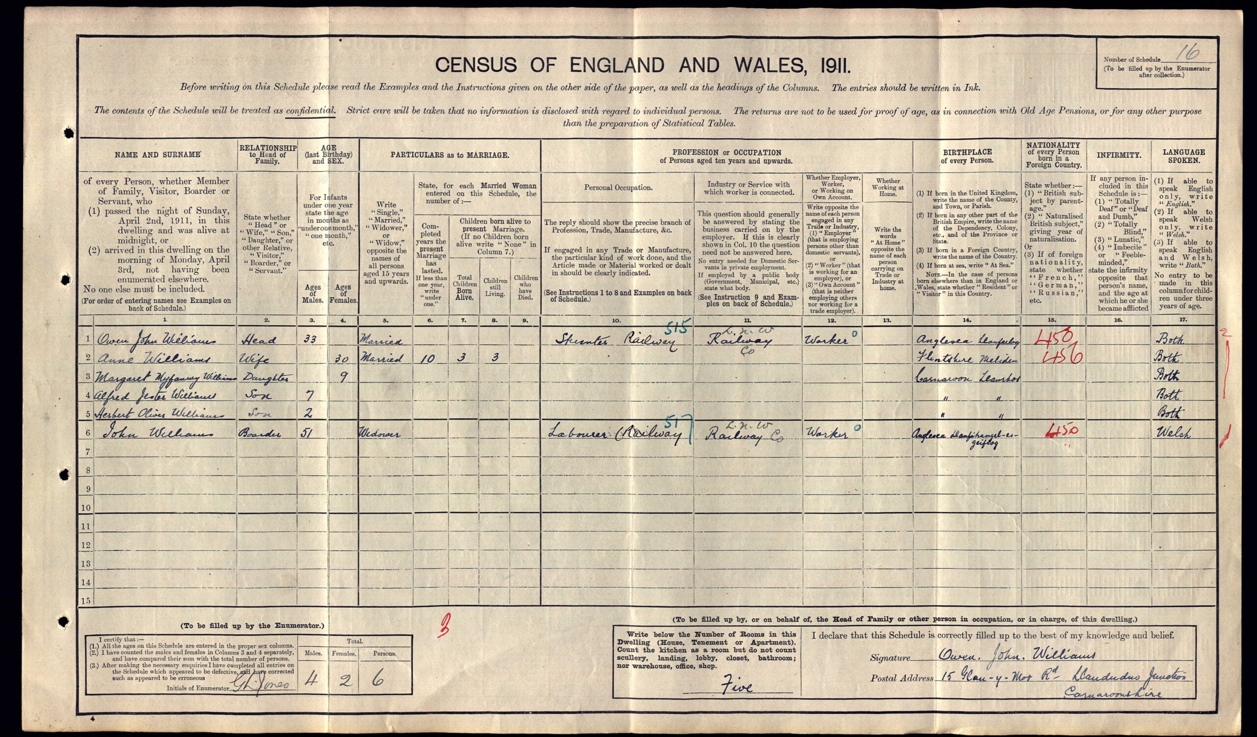 We see Owen John & Annie Williams, with their family, on the 1911 census, living at 15, Glan-y-mor Road, Llandudno Junction, Carnarvonshire. (5 Rooms). The census was beautifully written by Owen John Williams:-