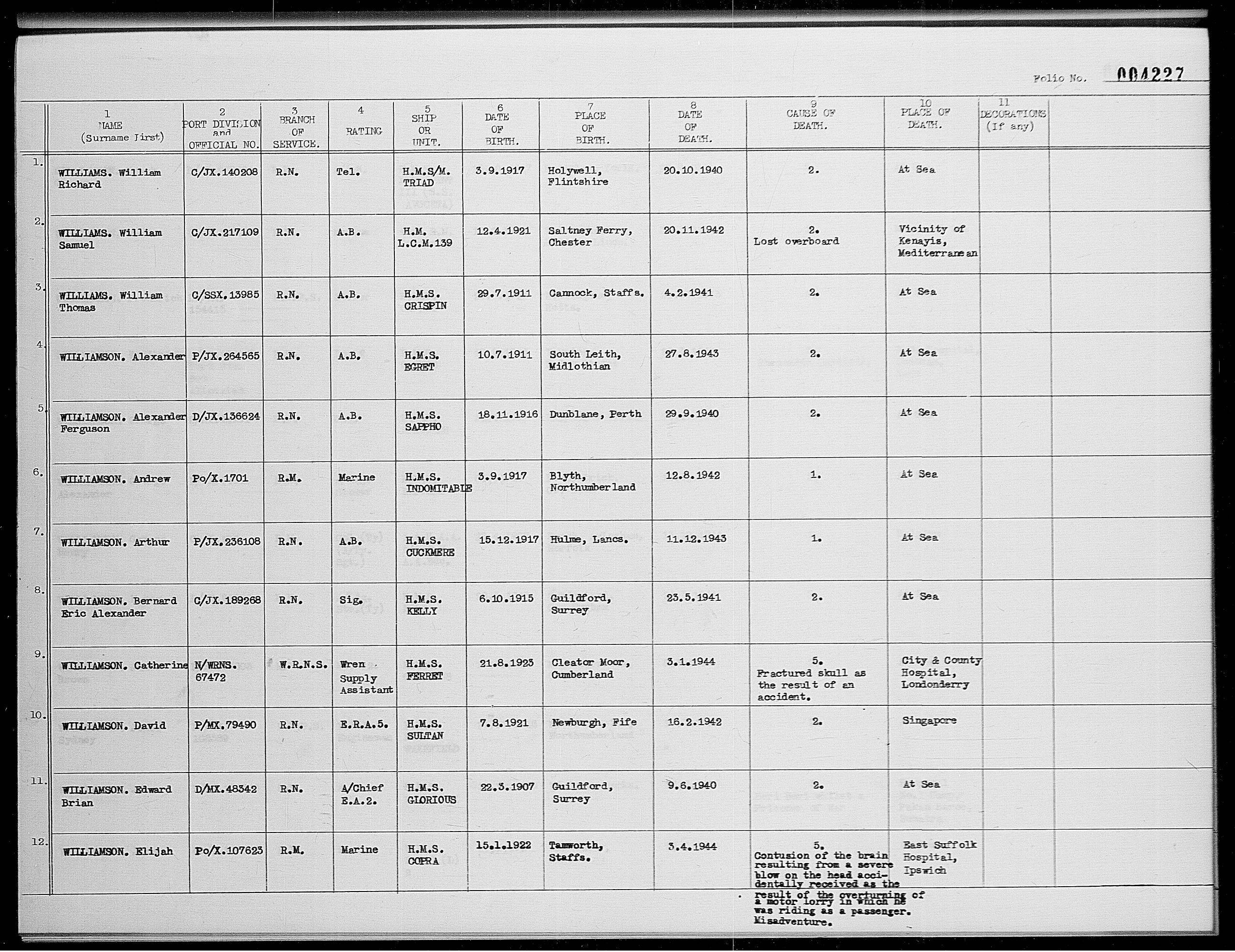 https://www.naval-history.net/xDKCas1942-11NOV2.htm – LCM.139, lost overboard – WILLIAMS, William S, Able Seaman, D/JX 217108, MPK – Many thanks to Temujin.
