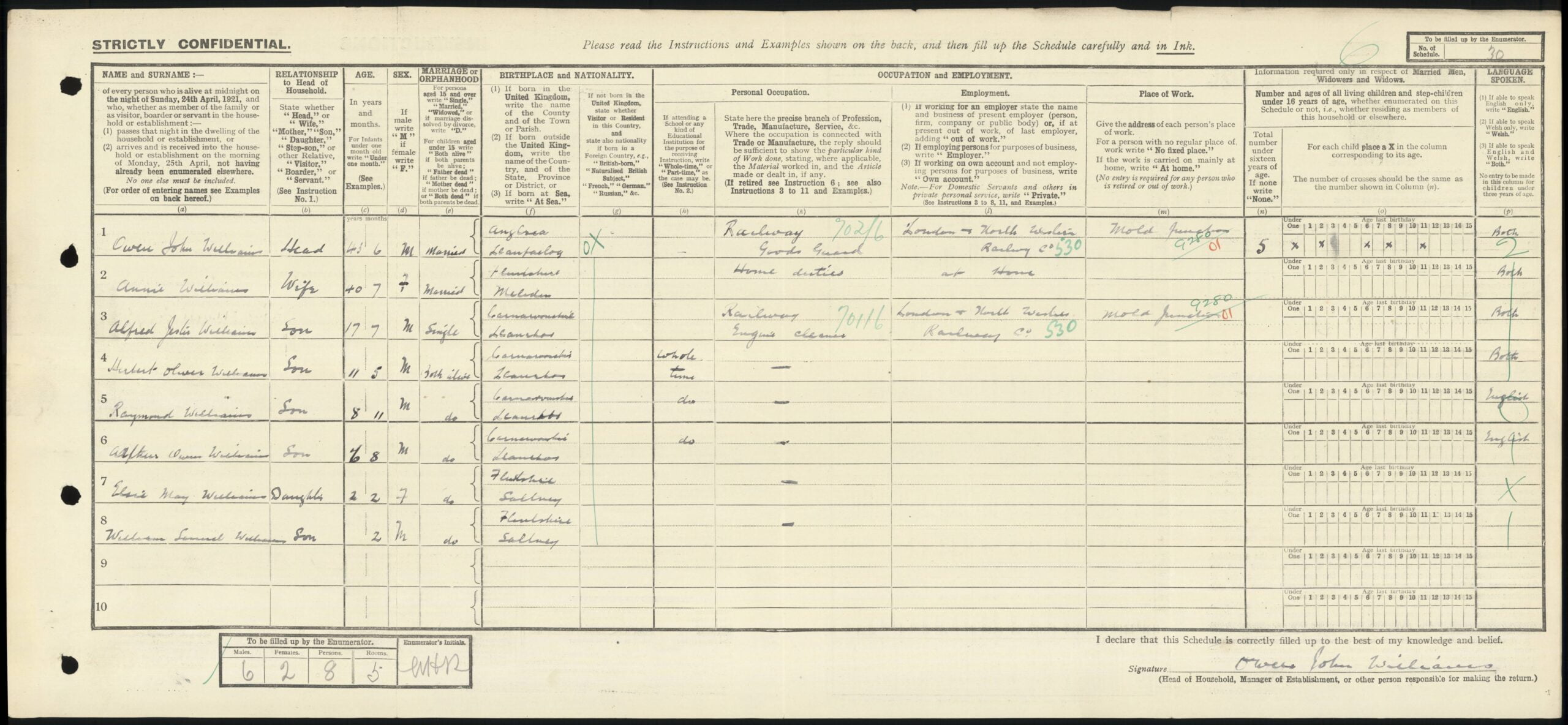 Head of the household was Owen John Williams, 33, Married 10 years, a Shunter on the Railway, (L.N.W. Railway Company) born Llanfaelog, Anglesey (All the family were Bilingual). His wife, Anne Williams, 30, born in Meliden, Flintshire, tells us that 3 children had been born and they were still living. The children were Margaret Myfanwy, 9, Alfred Jester, 7 and Herbert Oliver,2, all born in Llanrhos, Carnarvonshire. There was a Boarder, John Williams, 51, a widower and a Labourer on the Railway, (L.N.W. Railway Company), born Llanfihangel-es-geifrog., Anglesea.