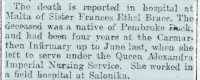 The names of the QAIMNS Sisters who lost their lives in the two world wars which includes Frances Ethel Brace can be found in the North Transept of York Minster, England and are known as the Five Sisters Window http://www.qaranc.co.uk/war_graves_memorials_nurses.php.